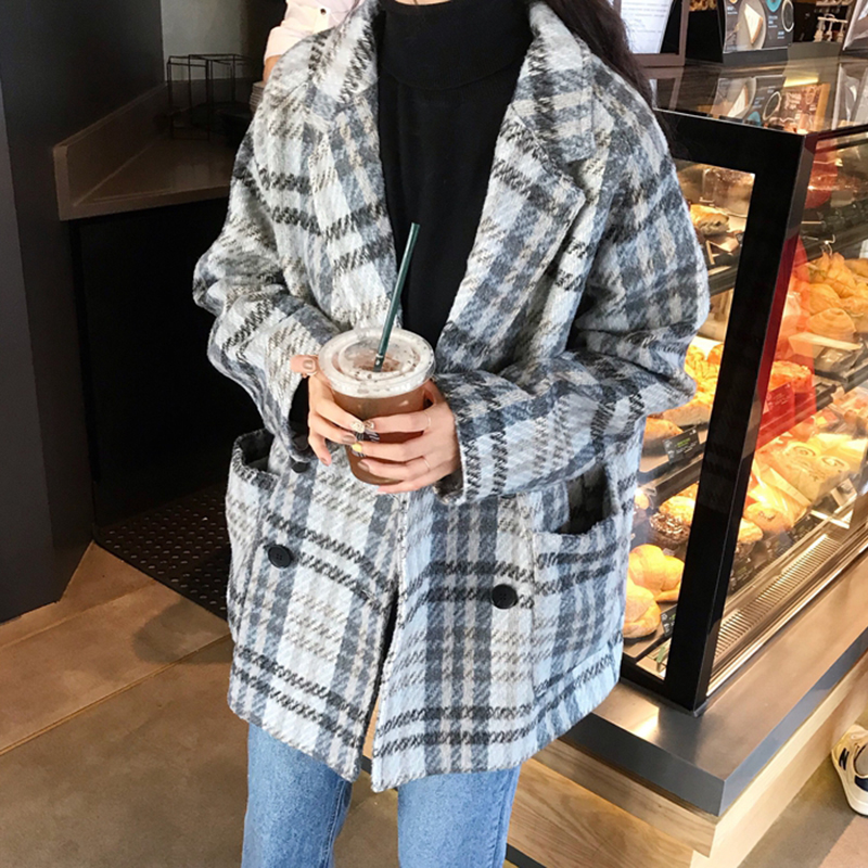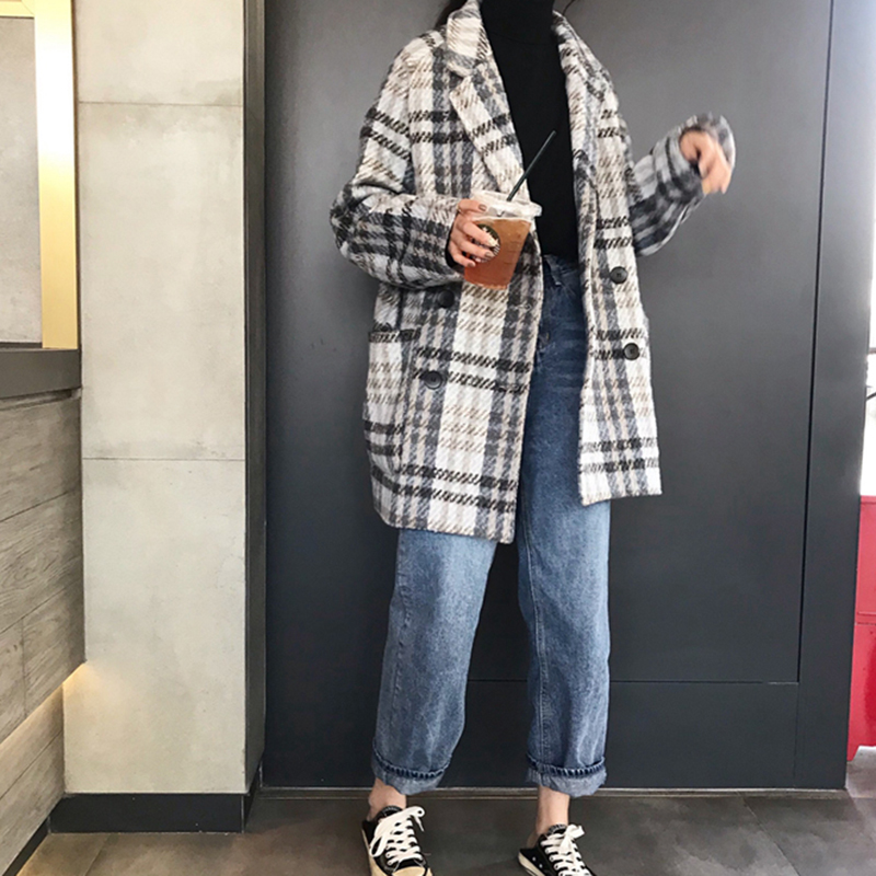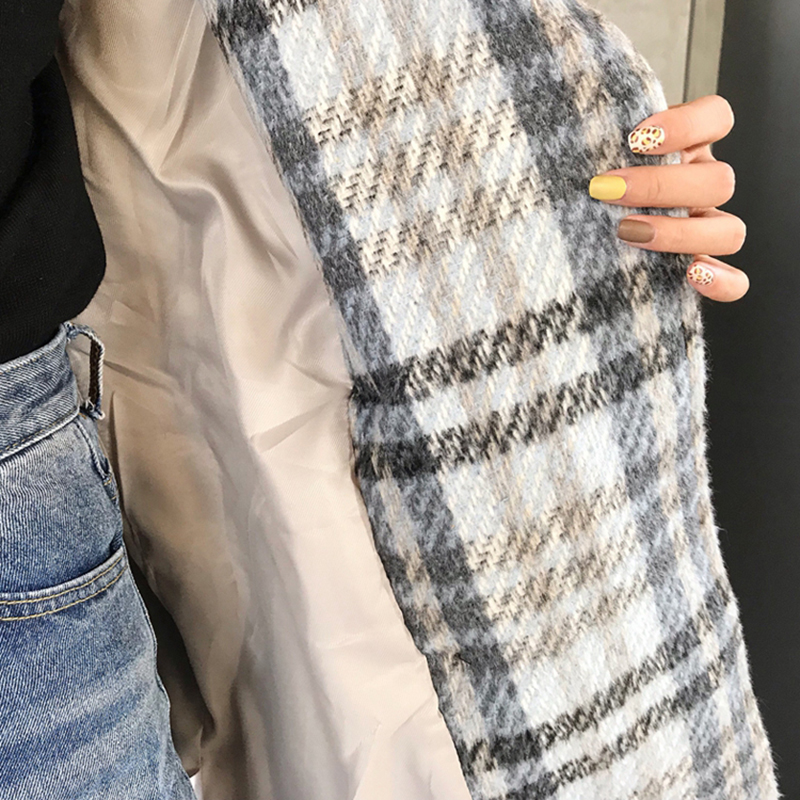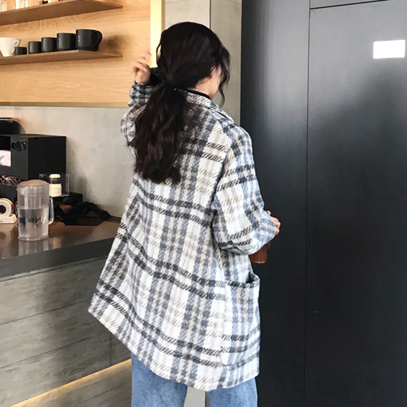 2018流行妮子大衣女秋冬裝新款韓版寬松西裝領中長款格子毛呢外套