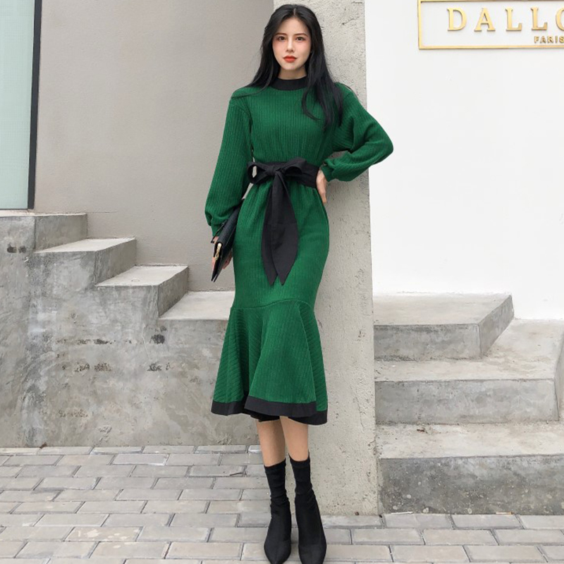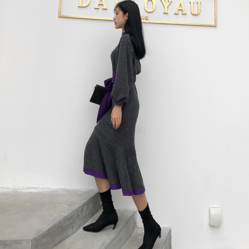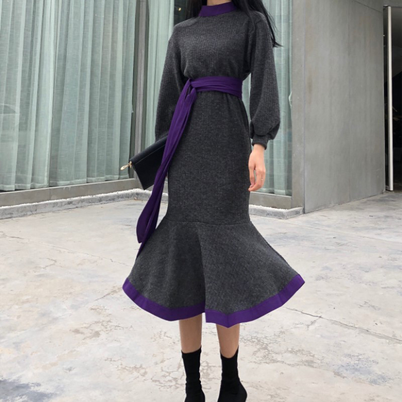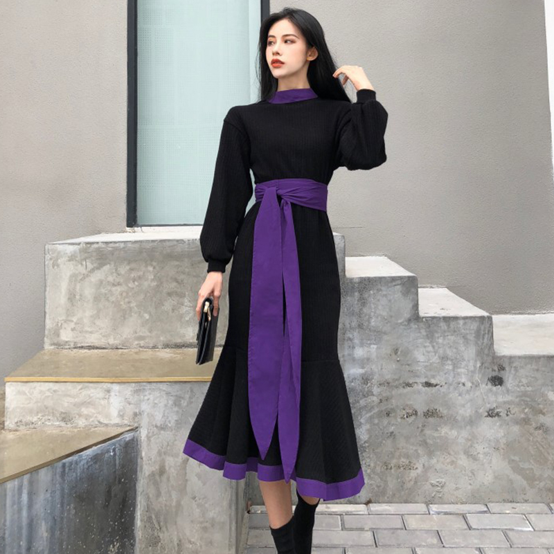 氣質收腰顯瘦中長連衣裙子女秋冬裝新款egg時尚拼色A字魚尾桔梗裙