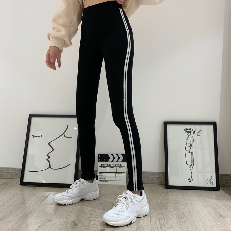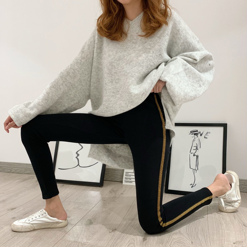 / 秋冬女裝2018新款黑色側邊條紋外穿加絨打底長褲高腰顯瘦小腳褲子