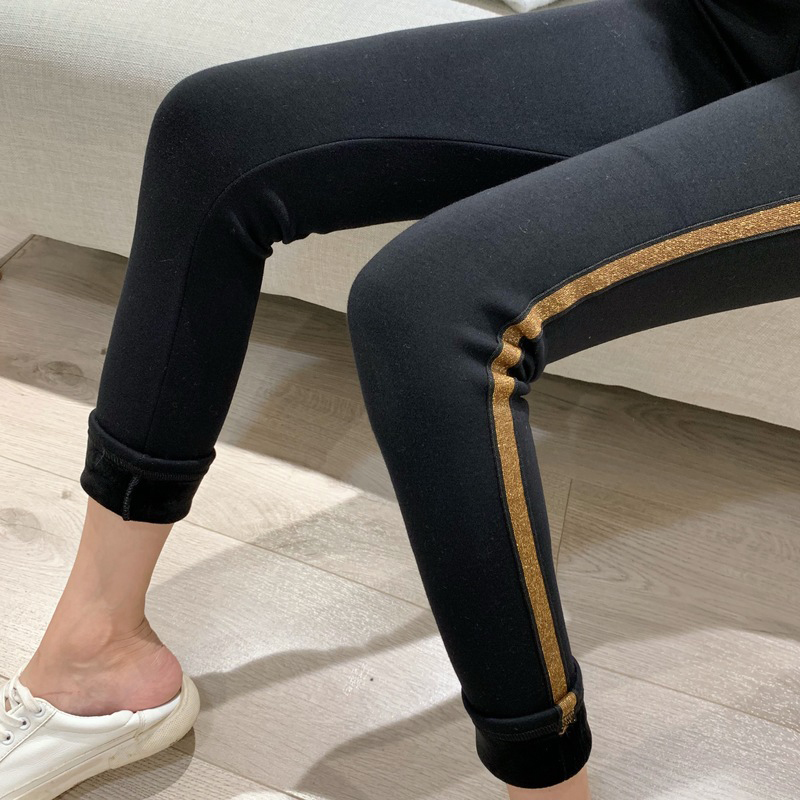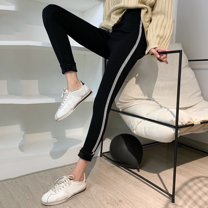 秋冬女裝2018新款黑色側邊條紋外穿加絨打底長褲高腰顯瘦小腳褲子