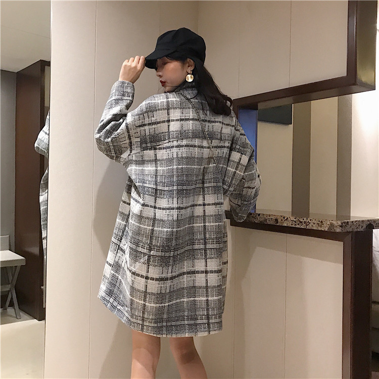 復古格子外套女秋裝2018新款ulzzang雙排扣寬松長款過膝呢子大衣