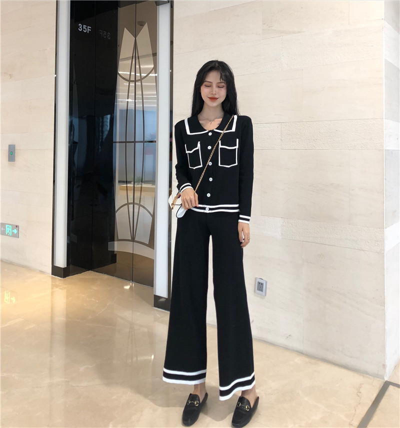 / 韓范女神套裝秋冬季新款針織顯瘦小香風短款上衣+闊腿長褲兩件套