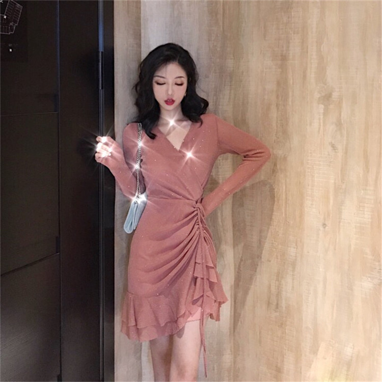 / 港味chic新款秋季復古V領交叉顯瘦抽繩系帶彈力亮片魚尾連衣裙女