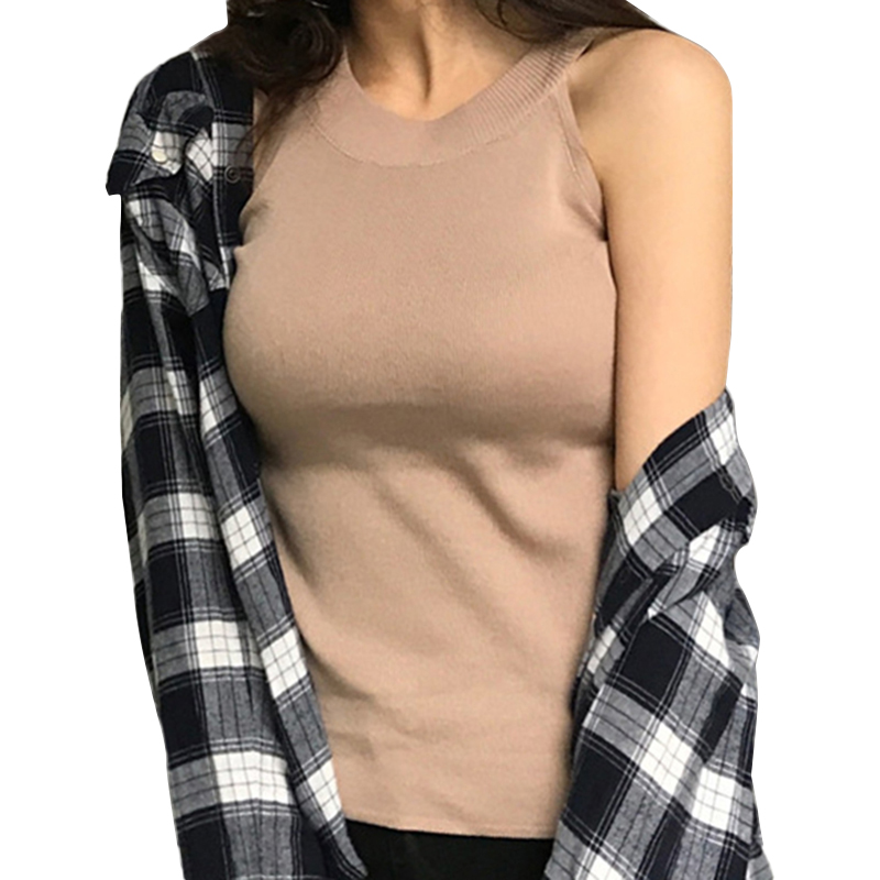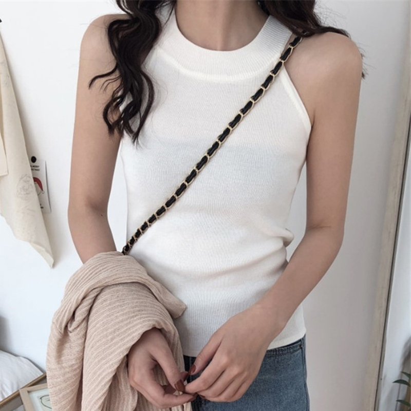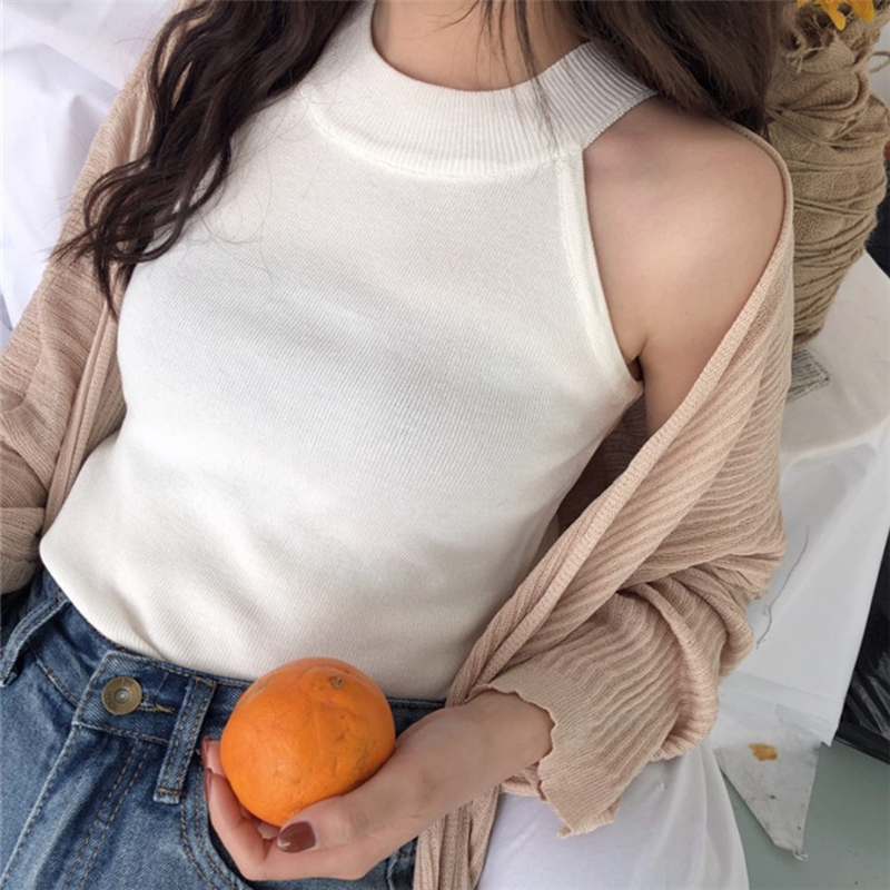 / 春裝新款女裝韓版chic風露肩無袖掛脖針織衫氣質修身短款打底背心
