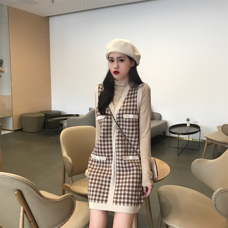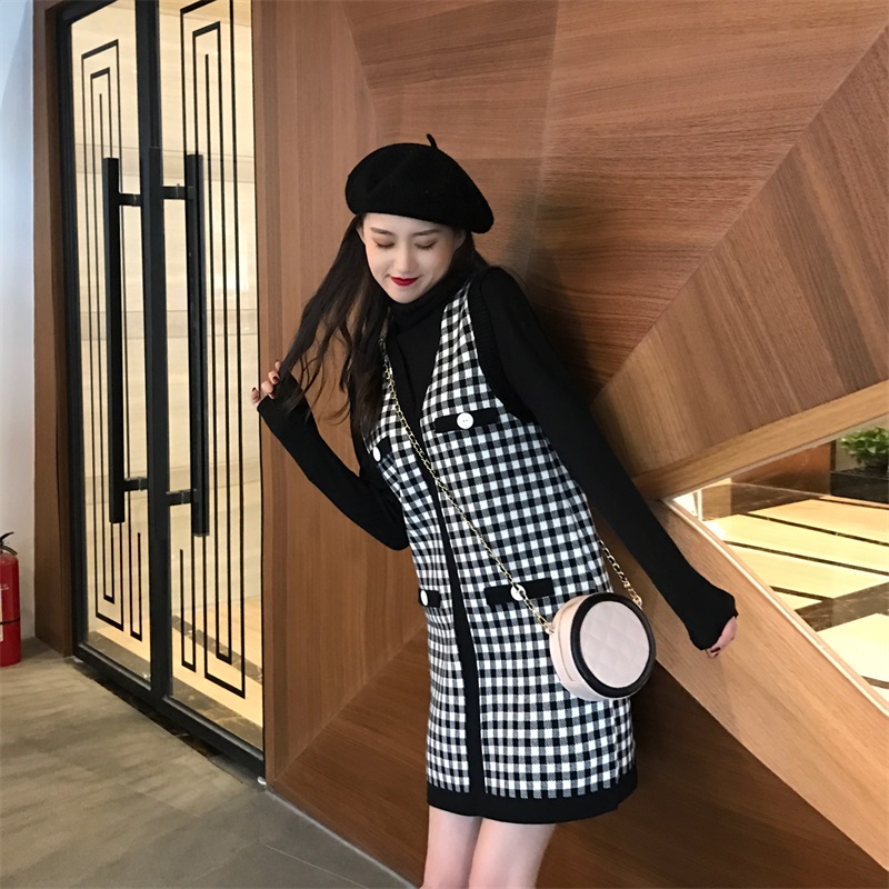 / 秋裝女2018新款套裝小香風千鳥格針織馬甲連衣裙+高領螺紋打底衫