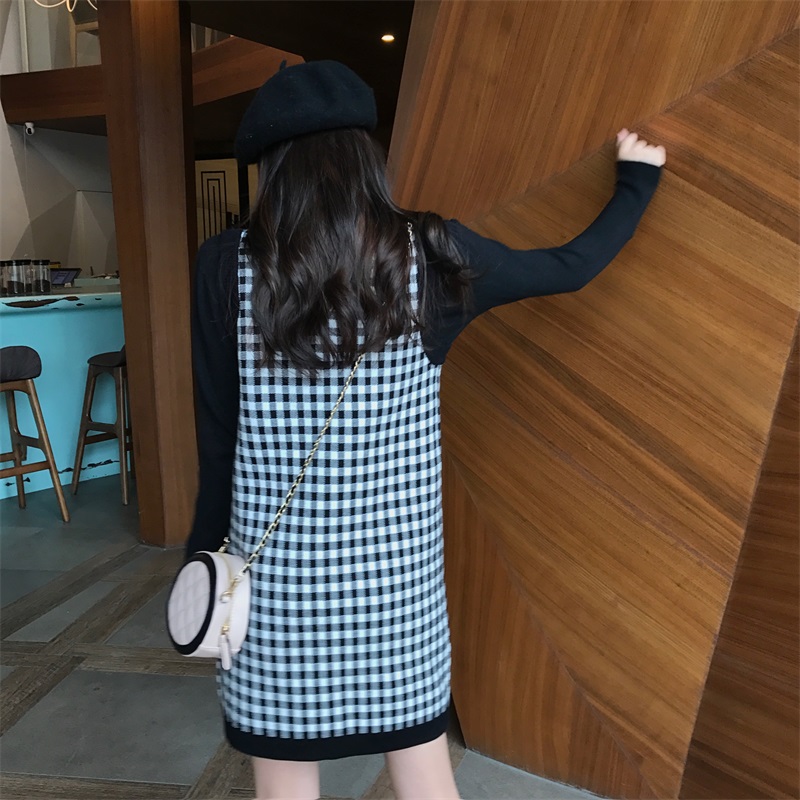 秋裝女2018新款套裝小香風千鳥格針織馬甲連衣裙+高領螺紋打底衫