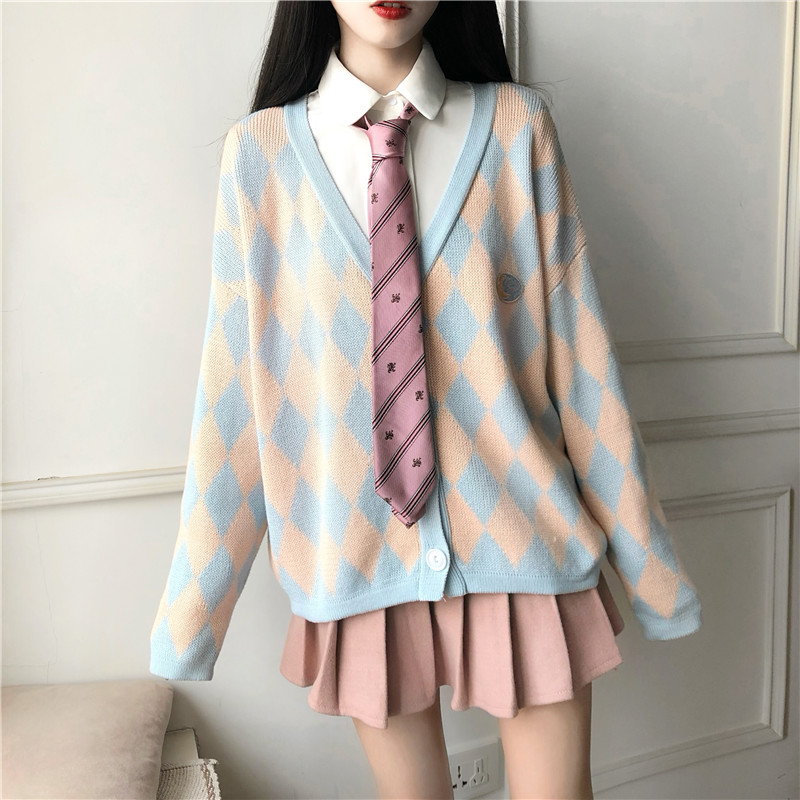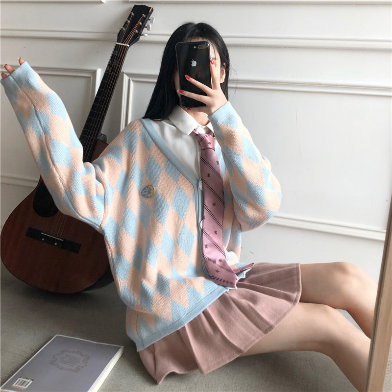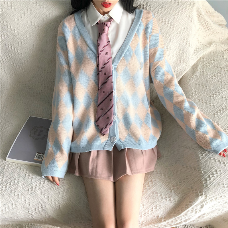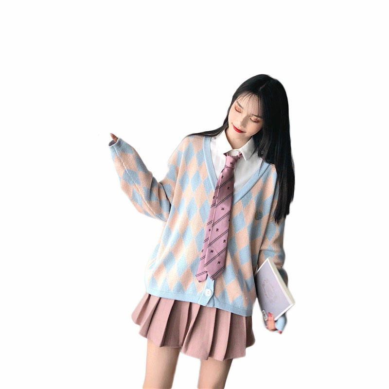 韓國復古風寬松顯瘦菱格毛衣開衫+粉色毛呢半身裙+襯衣時尚三件套