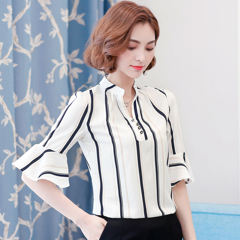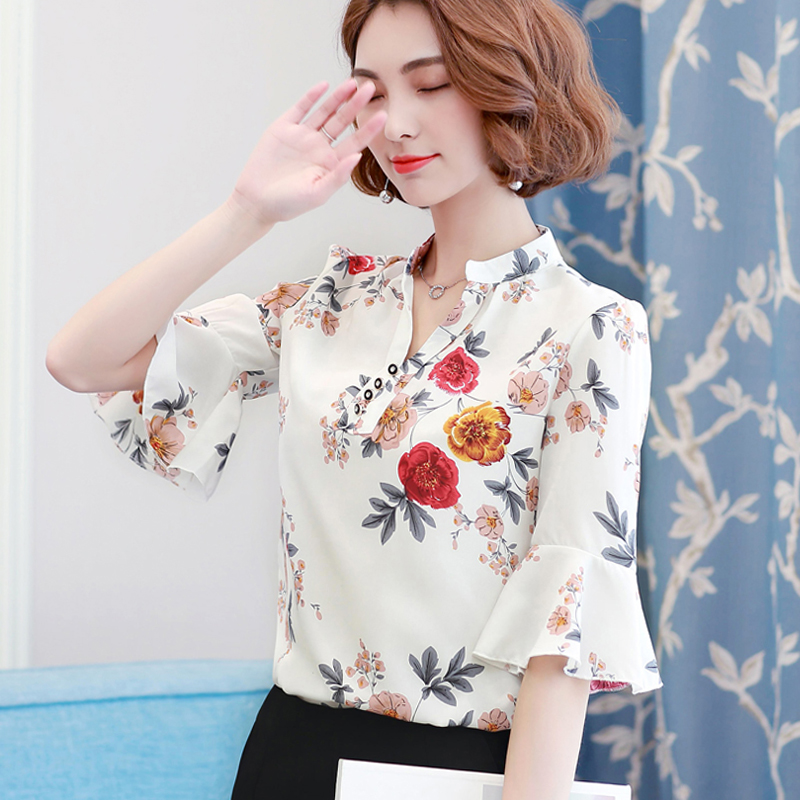 / 夏新款短袖V領雪紡衫喇叭袖襯衫T恤上衣花色打底衫寬松大碼女