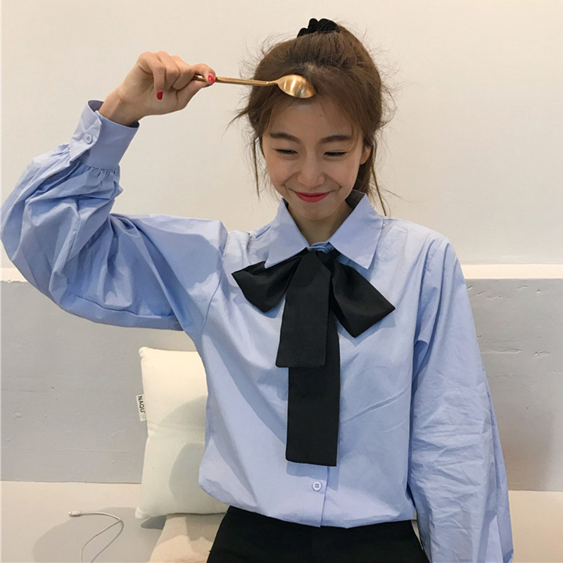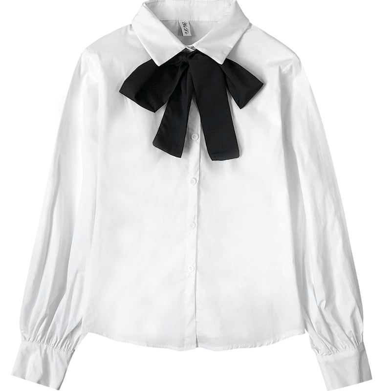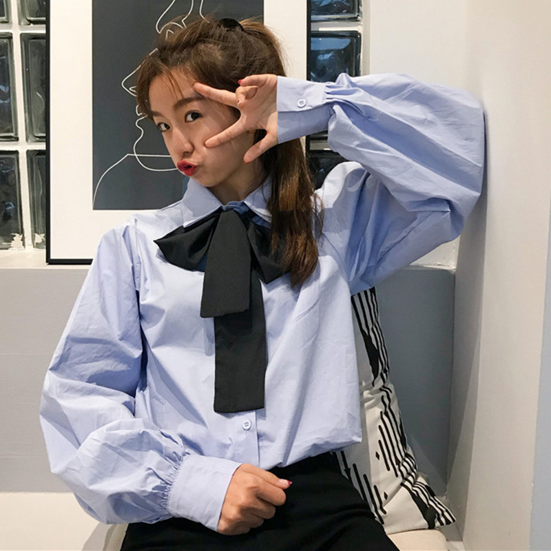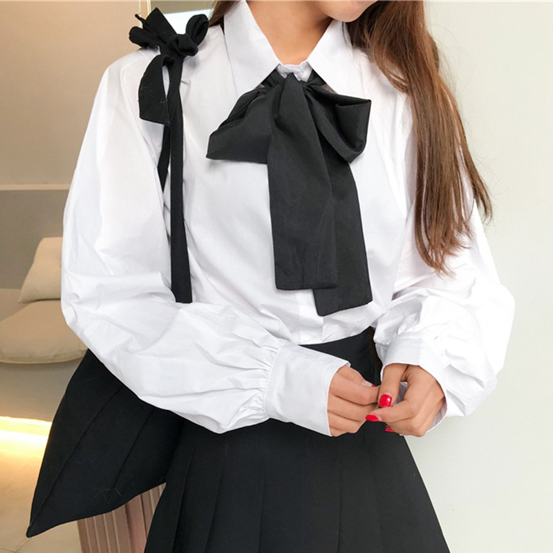 / 小清新學生韓版寬松白襯衫女秋裝新款學院風蝴蝶結領帶泡泡袖襯衣