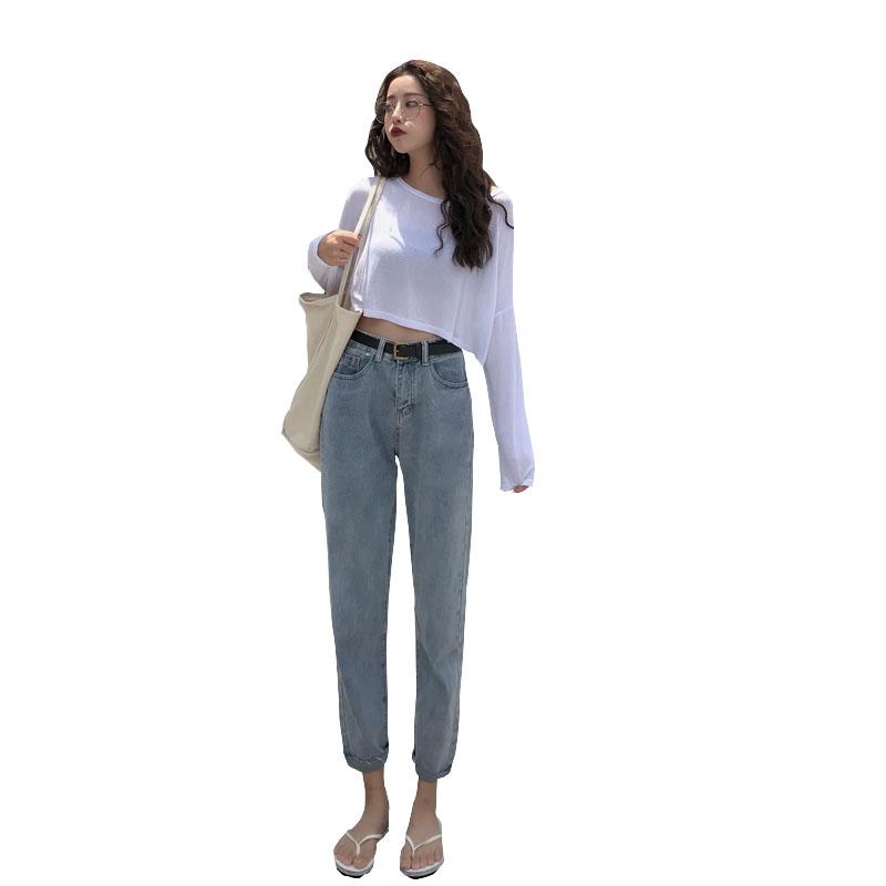 牛仔褲女夏時尚復古風休閑百搭淺色高腰直筒修身顯瘦小腳牛仔褲潮