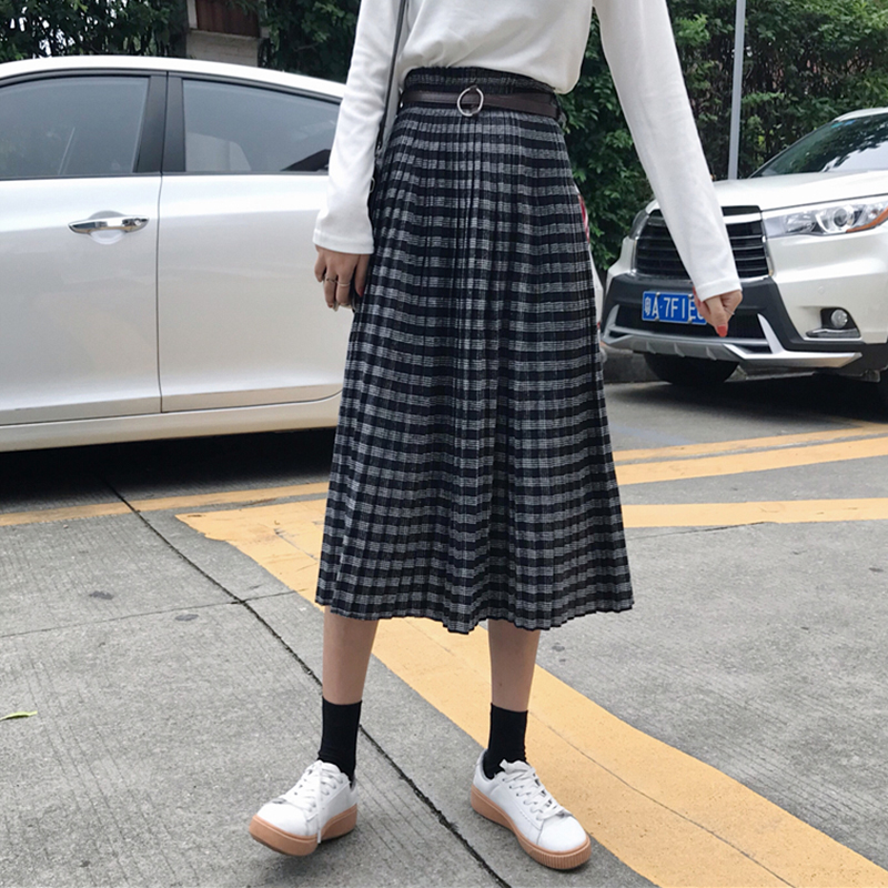 中長款毛呢復古格子半身裙女秋冬裝2018新款韓版高腰a字百褶裙子