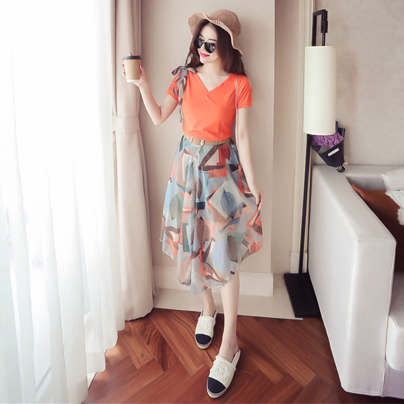 夏季新款女裝韓版學生兩件套連衣裙女短袖上衣半身裙雪紡套裝