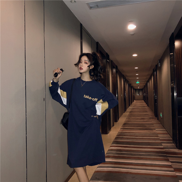早秋衛衣2018新款女長袖韓版chic寬松顯瘦中長款拼色連衣裙衛衣潮
