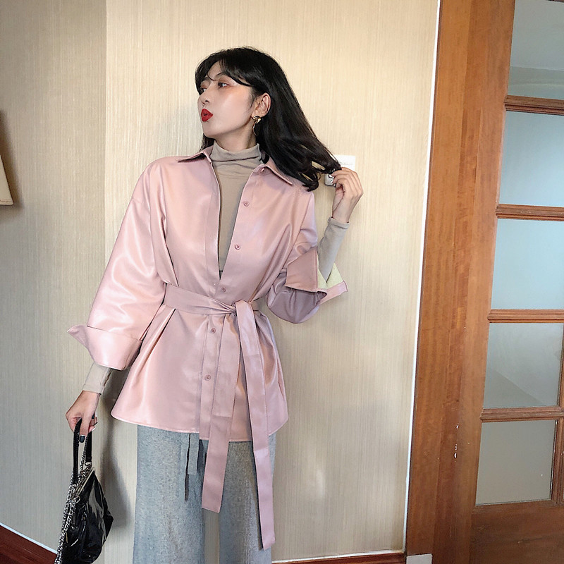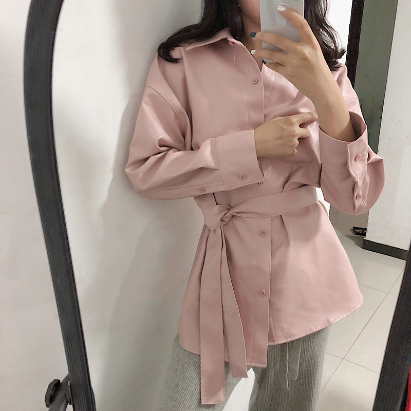 2018新款韓版chic秋款單排扣襯衣柔軟pu小皮衣寬松系帶腰短外套女