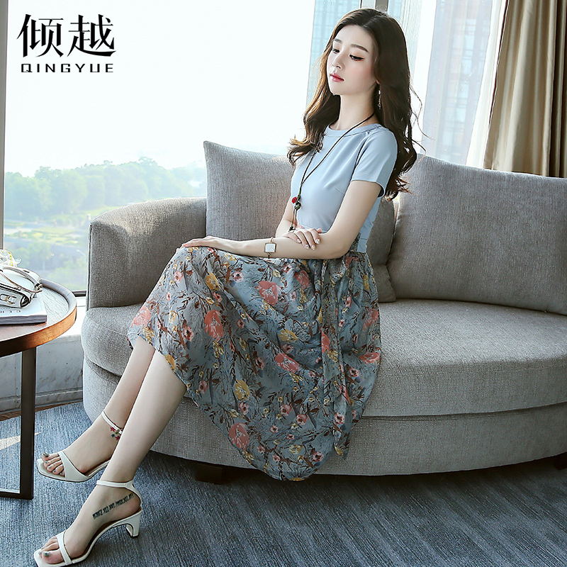 / 雪紡連衣裙2017夏季新款韓版女修身顯瘦中長款時尚印花短袖裙子潮