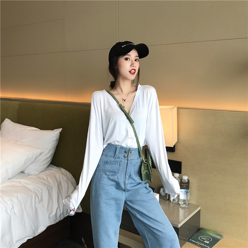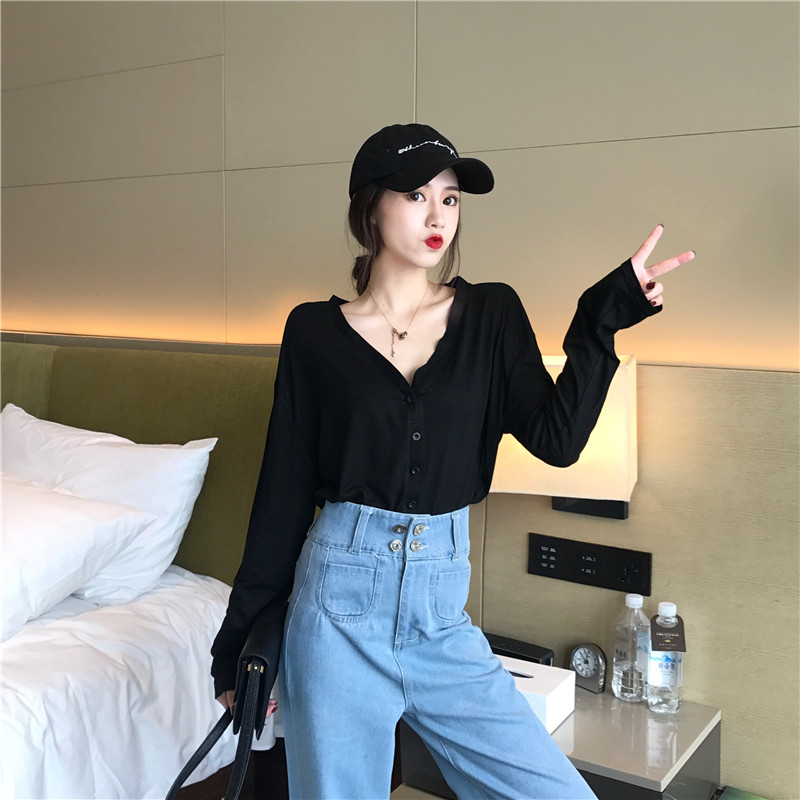 / 韓國復古風女神套裝秋寬松V領長袖百搭打底衫+高腰排扣牛仔闊腿褲