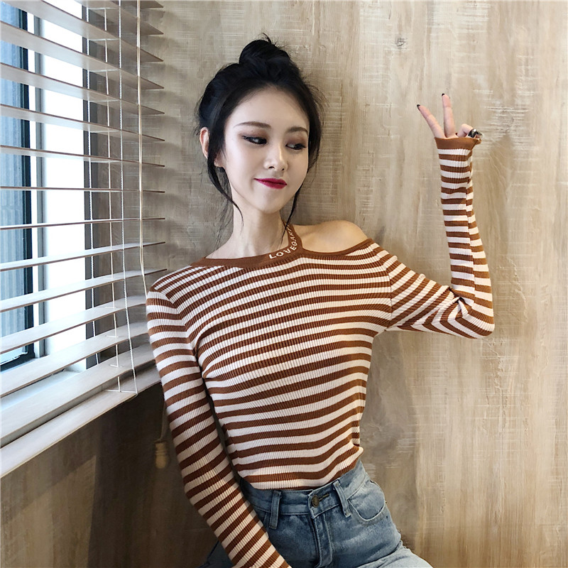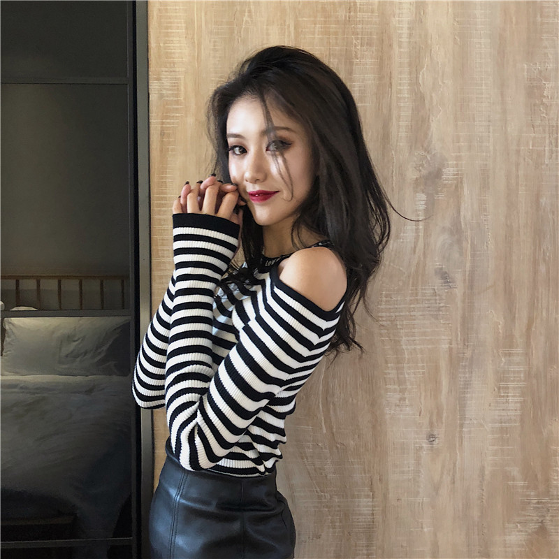條紋針織衫女長袖2018秋裝新款chic掛脖露肩修身小心機撞色打底衫