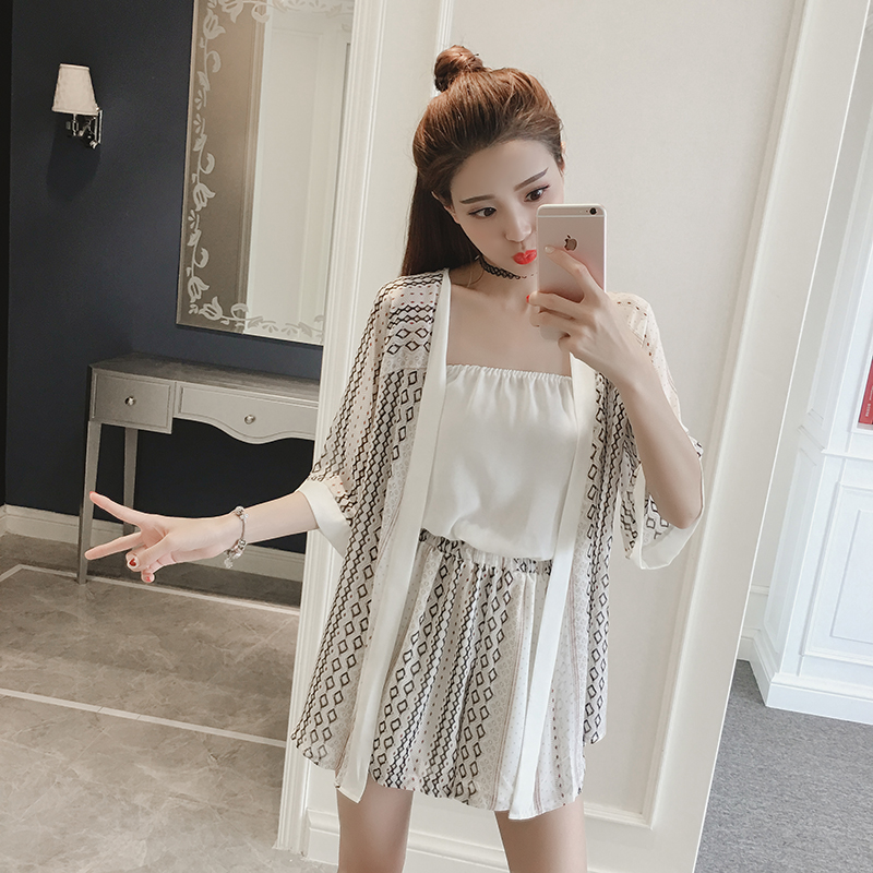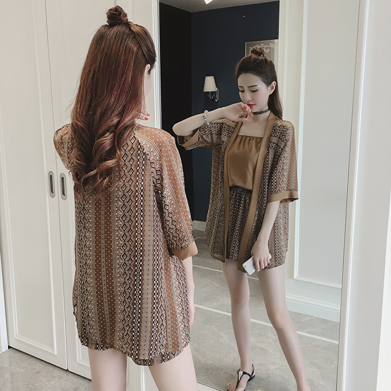 / 夏季新款女裝韓版開衫外套印花雪紡套裝女氣質休閑短褲兩件套