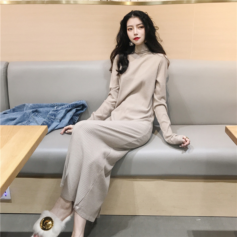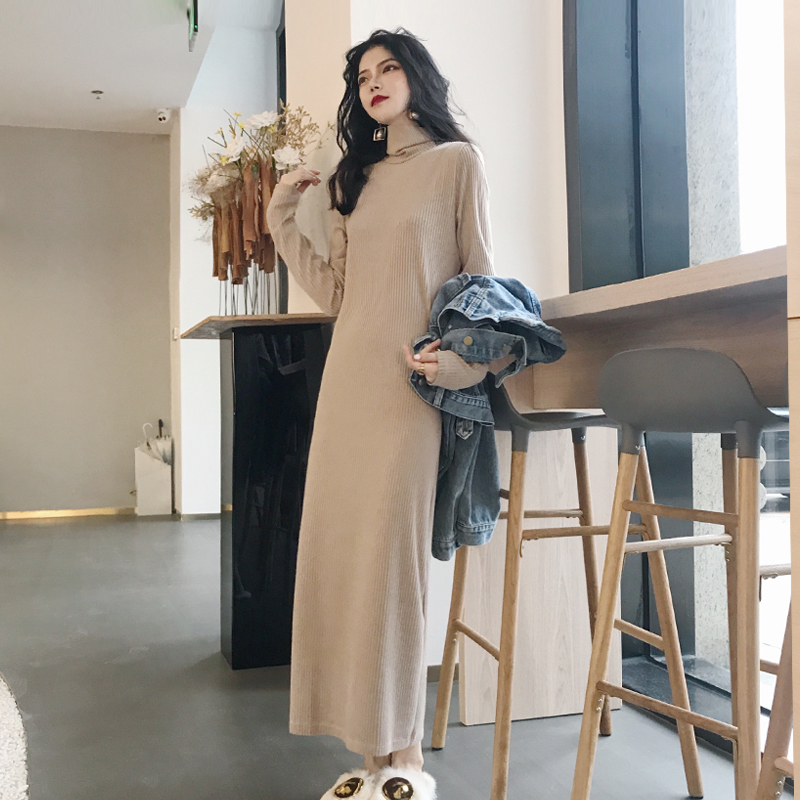 / 裙子女秋新款韓版chic寬松百搭過膝長裙后開叉高領長袖打底連衣裙