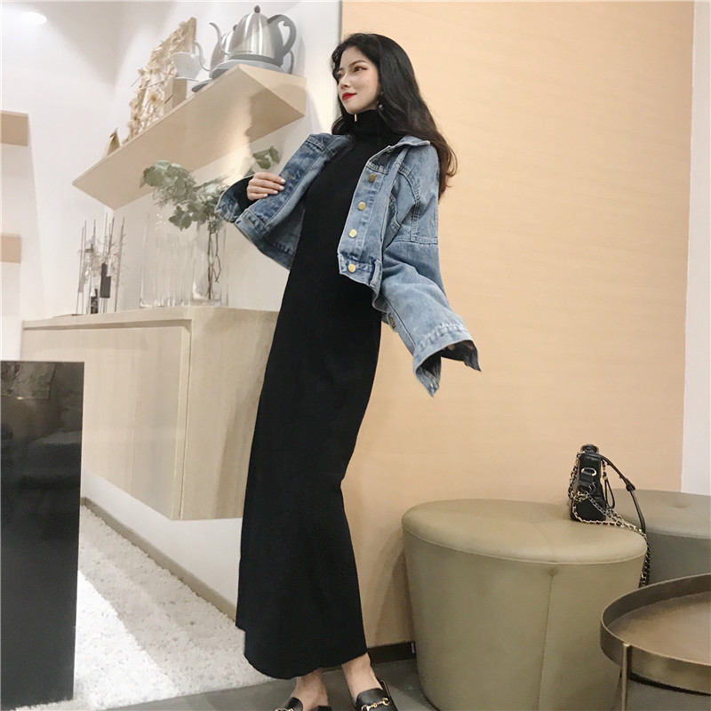 裙子女秋新款韓版chic寬松百搭過膝長裙后開叉高領長袖打底連衣裙