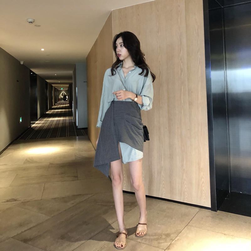 復古條紋長袖襯衫+高腰抹胸式半身短裙兩件套裝女夏新款分開拍潮