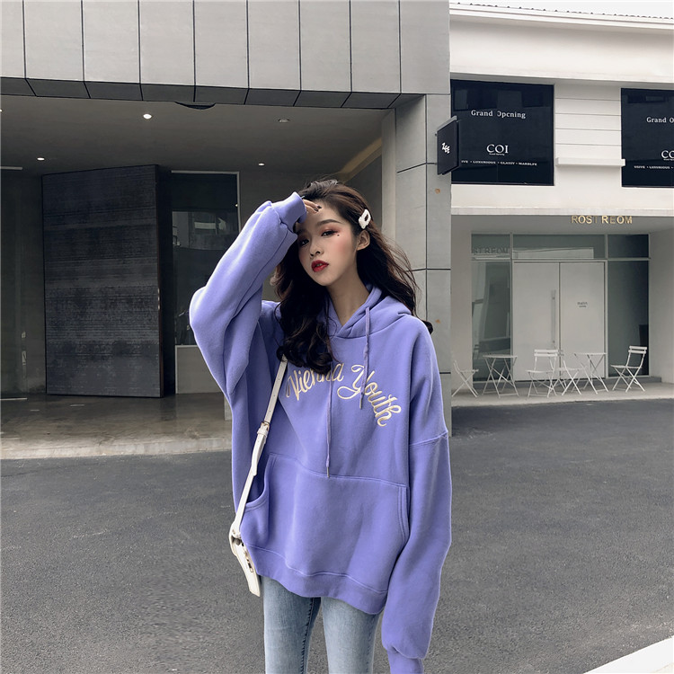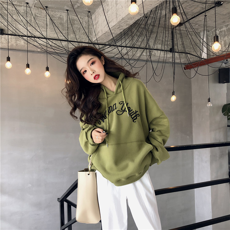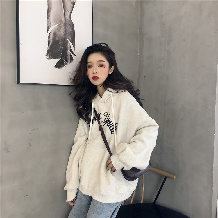 / 港味慵懶風上衣女寬松復古刺繡英文連帽加絨百搭慵懶衛衣女秋新款