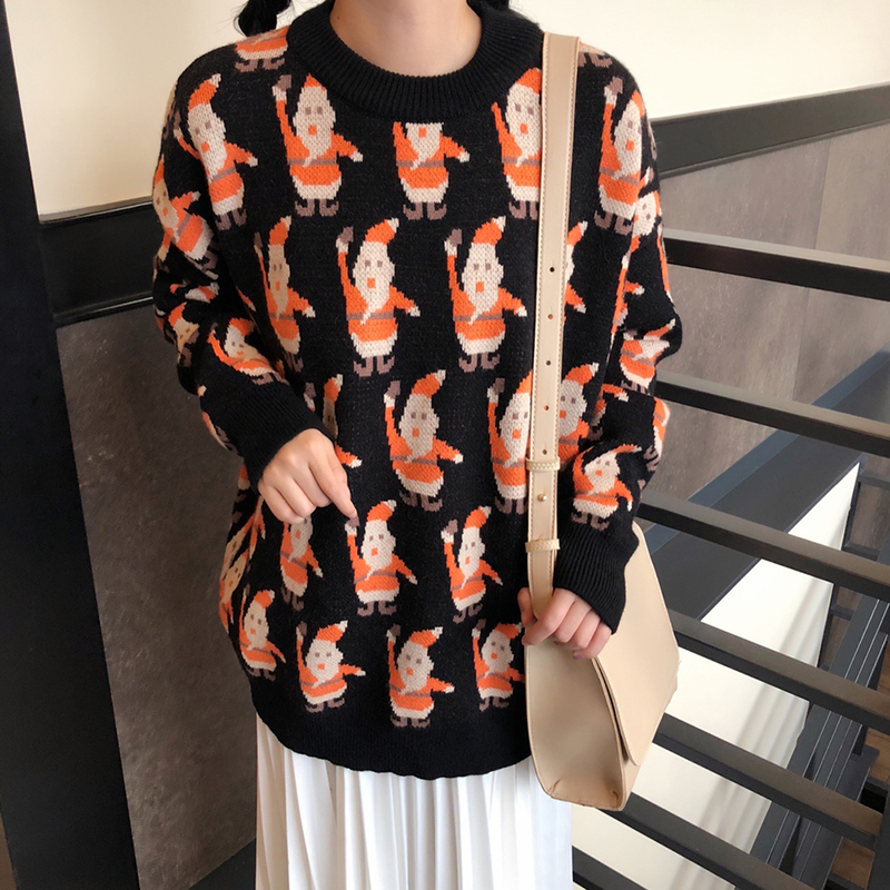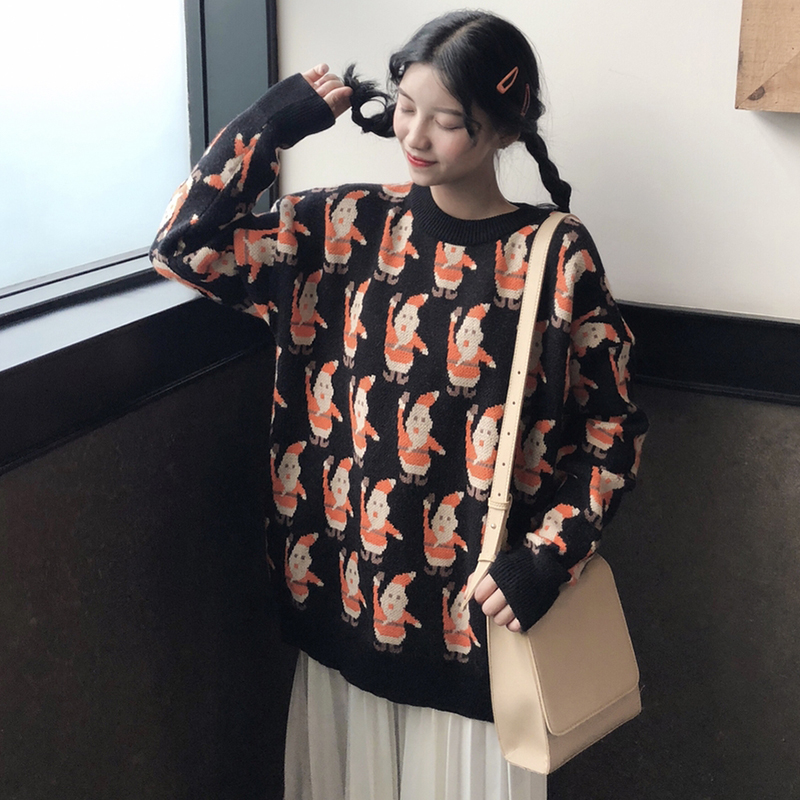 港味chic圣誕老人寬松長袖套頭毛衣女冬裝2018新款寬松針織衫外套