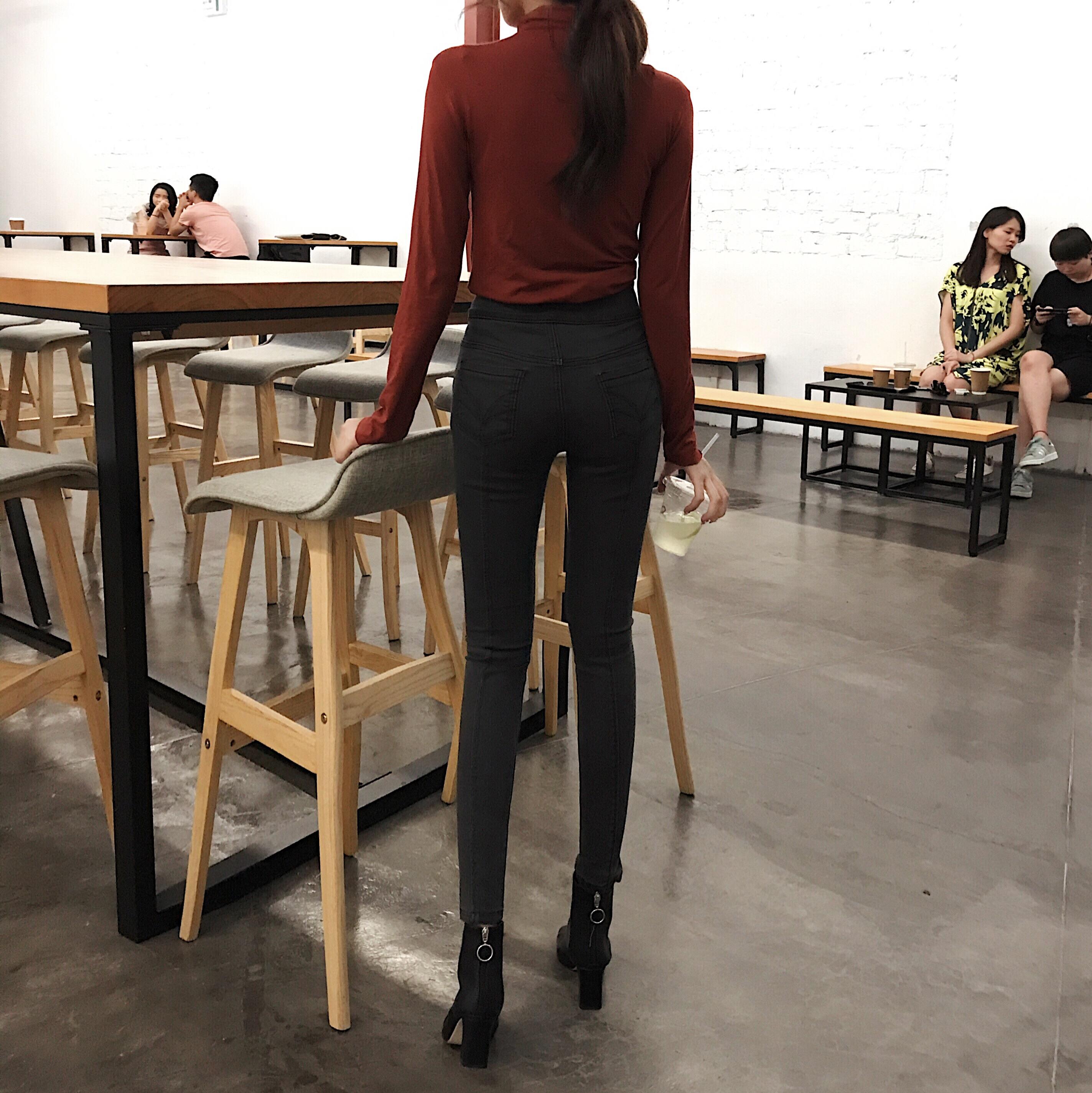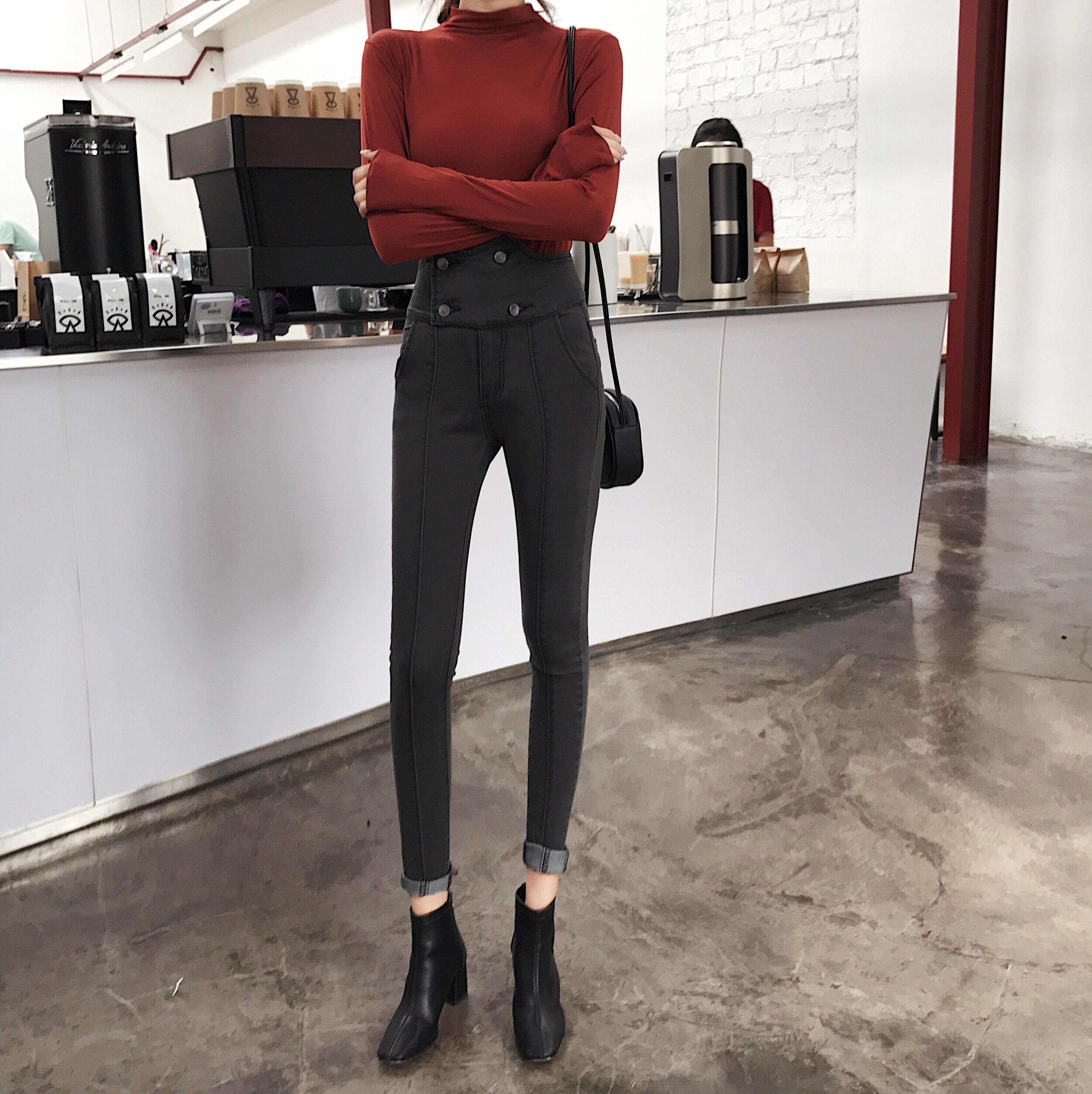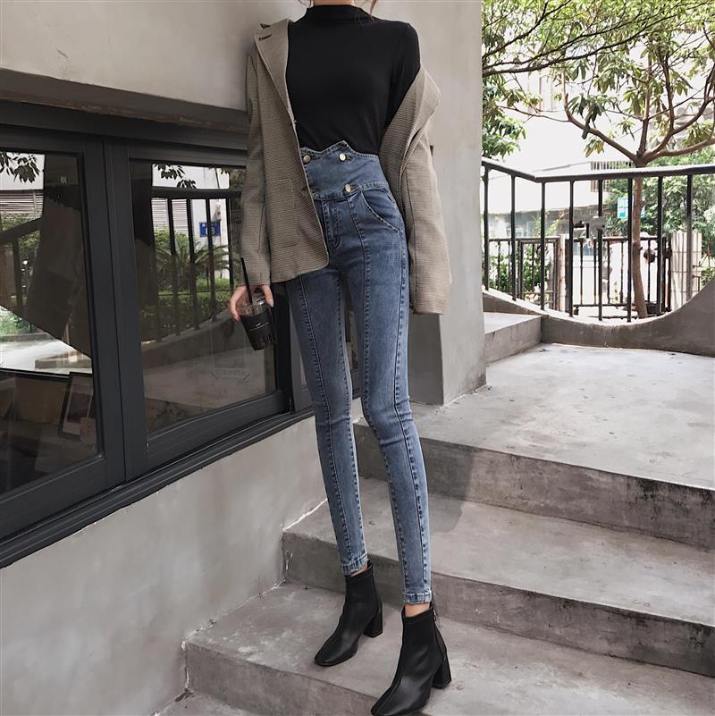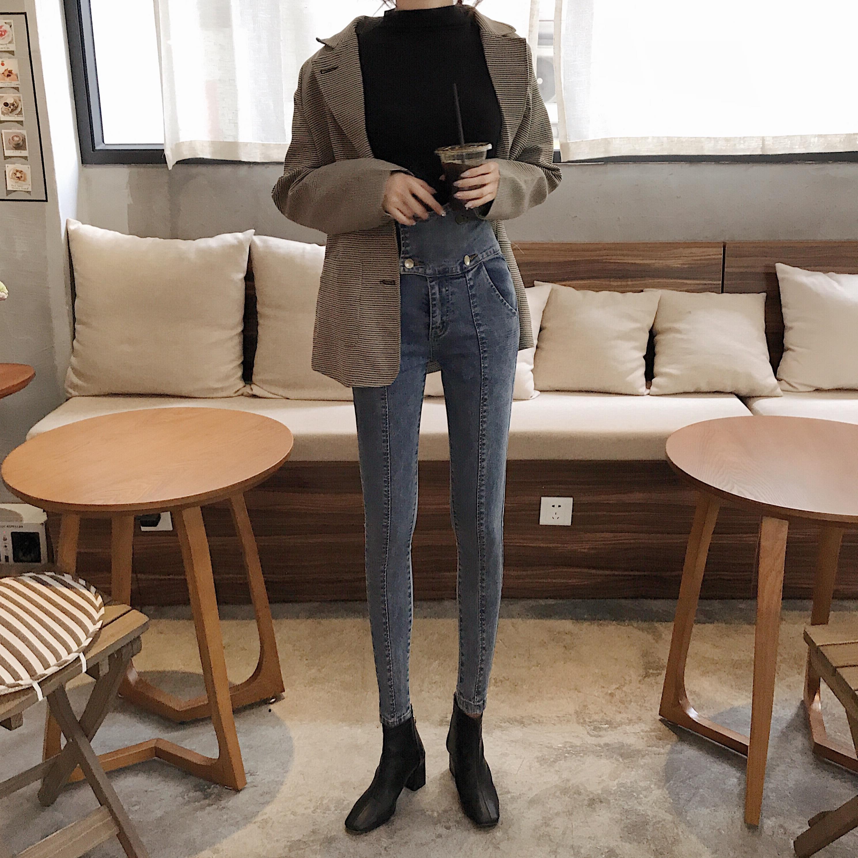 / 韓國不規則高腰牛仔褲女裝秋季新款百搭時尚緊身小腳褲顯瘦長褲潮
