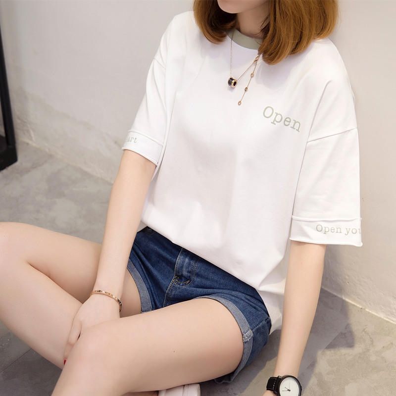 / 夏裝新款女裝白色t恤女短袖韓版字母體恤衫寬松上衣百搭衣服