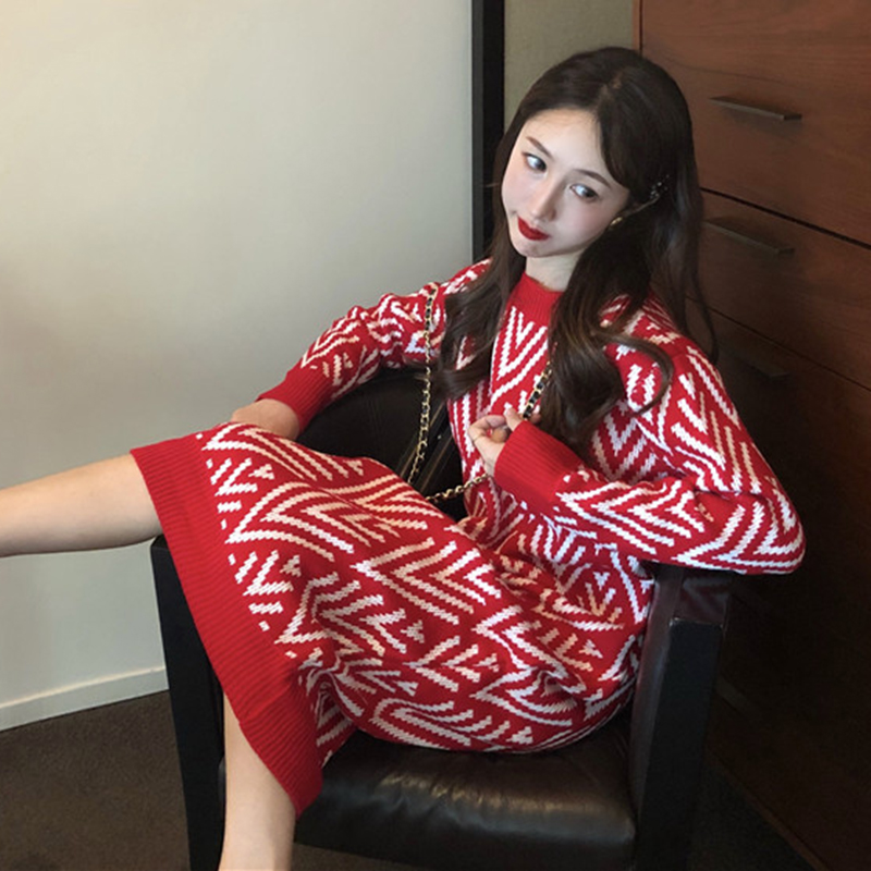 秋裝女2018新款韓版拼色圓領長袖針織連衣裙學生寬松顯瘦中長裙子