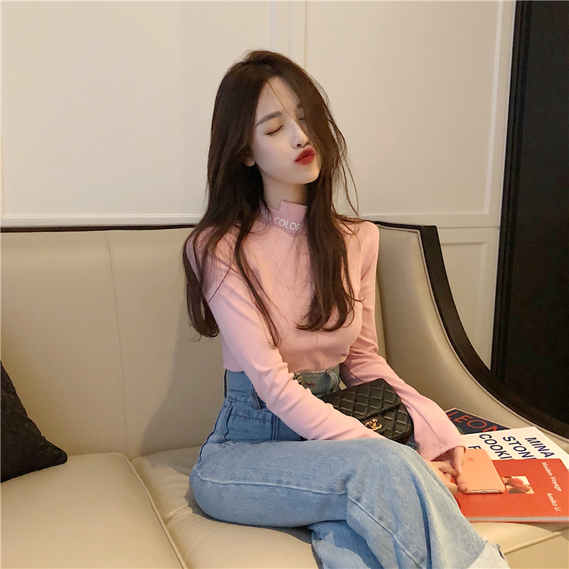 復古韓國chic風百搭半高領字母印花加絨加厚長袖T恤女新款打底衫
