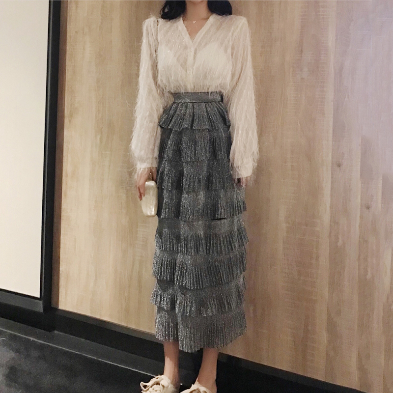 / 韓版時尚套裝女秋新款氣質毛毛長袖上衣+高腰閃閃亮絲蛋糕半身裙