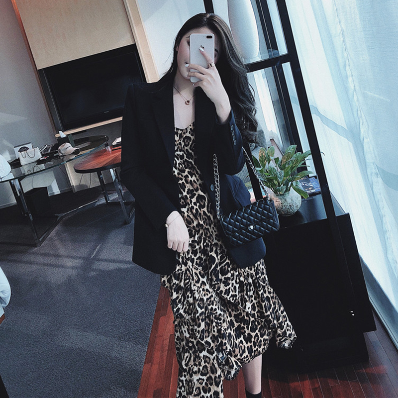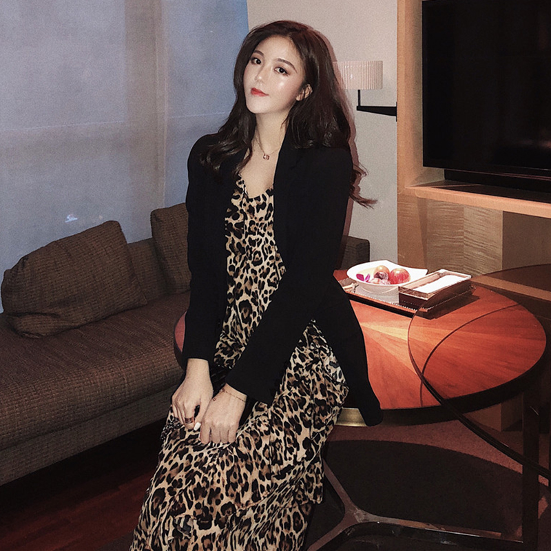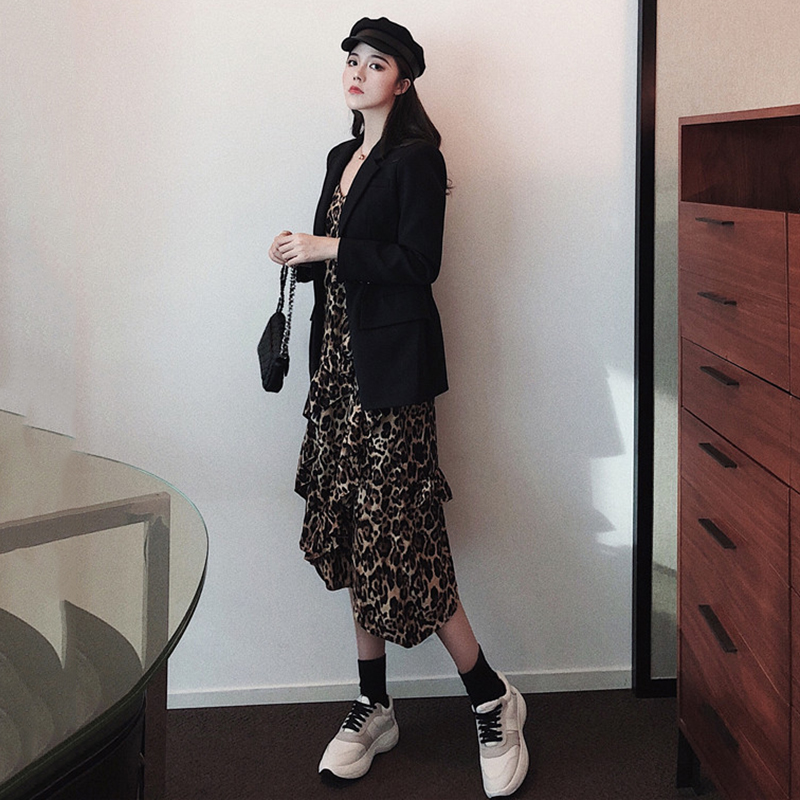/ 連衣裙秋2018新款女裝韓版荷葉邊打底豹紋裙子氣質V領吊帶中長裙