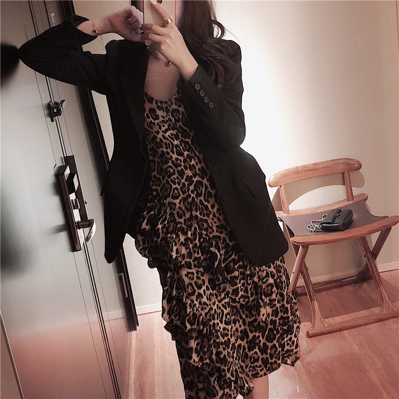 連衣裙秋2018新款女裝韓版荷葉邊打底豹紋裙子氣質V領吊帶中長裙