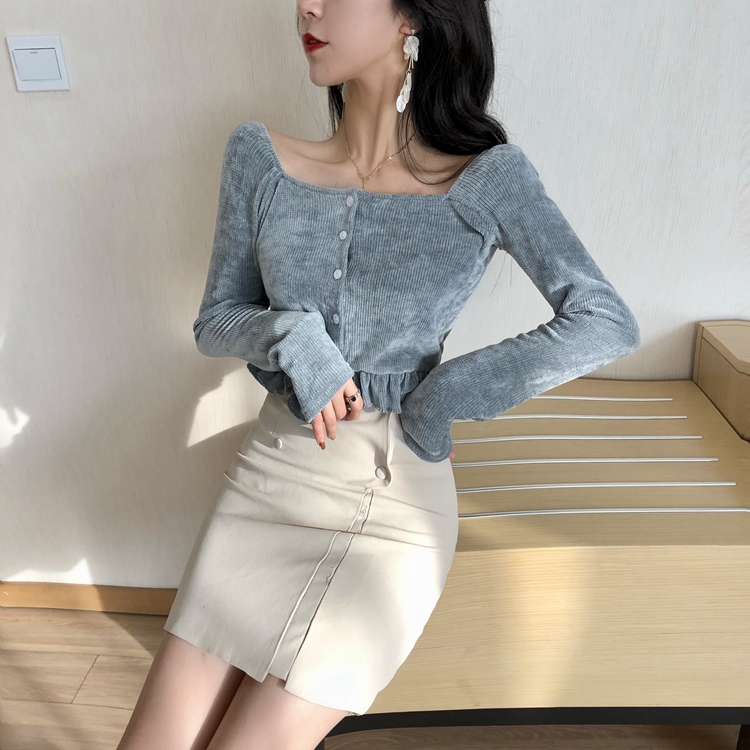 冬裝上衣女慵懶長袖t袖女韓版時尚百搭針織木耳邊內搭修身顯瘦Tee