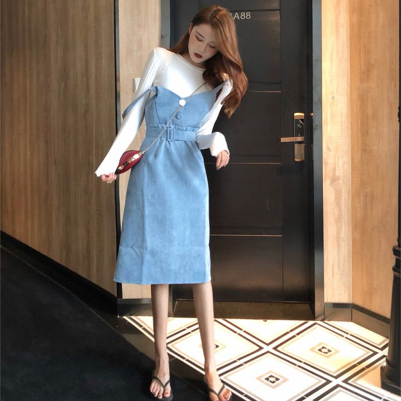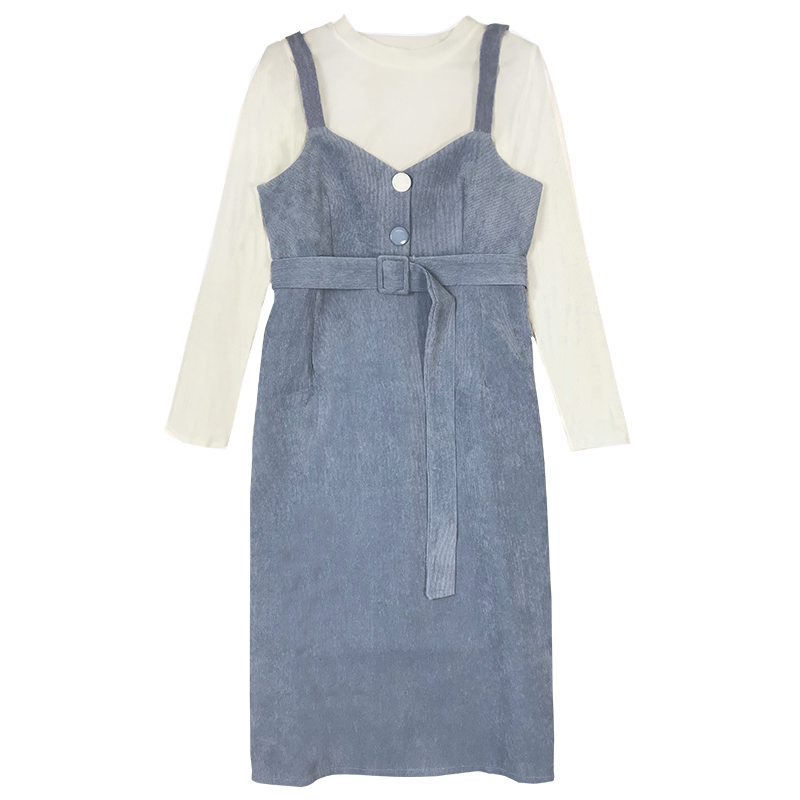 韓版時尚套裝女秋新款長袖打底衫T恤上衣+高腰燈芯絨背帶連衣裙子