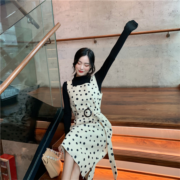 韓版秋裝女2018新款套裝半高領T恤女打底衫+呢料波點裙時尚兩件套