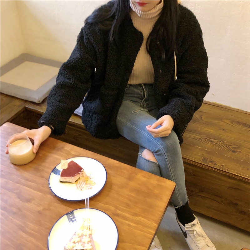 復古韓版新款女裝冬季短款加厚保暖羊羔毛翻領外套女時尚百搭絨衫