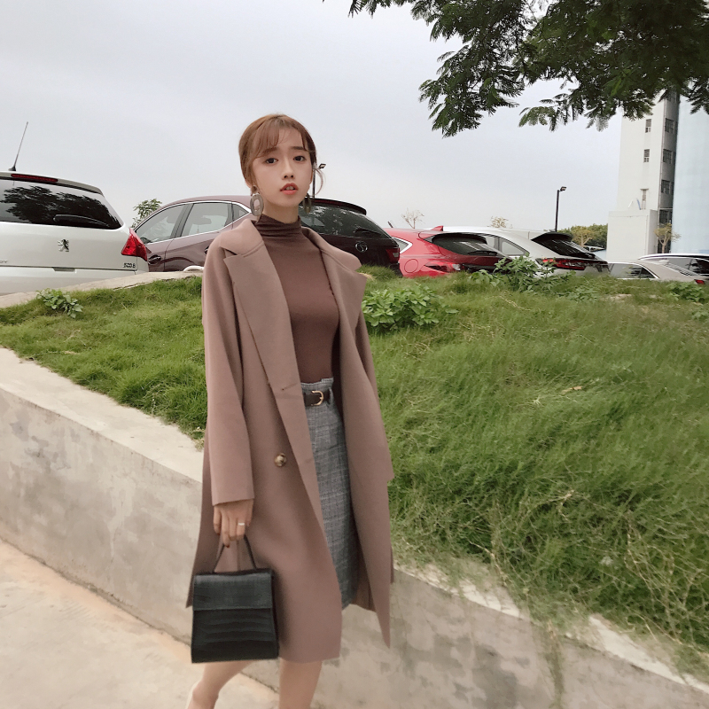 秋冬韓版百搭款氣質長袖毛呢外套女中長款過膝妮子大衣(送腰帶)