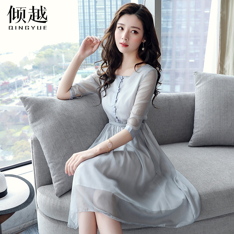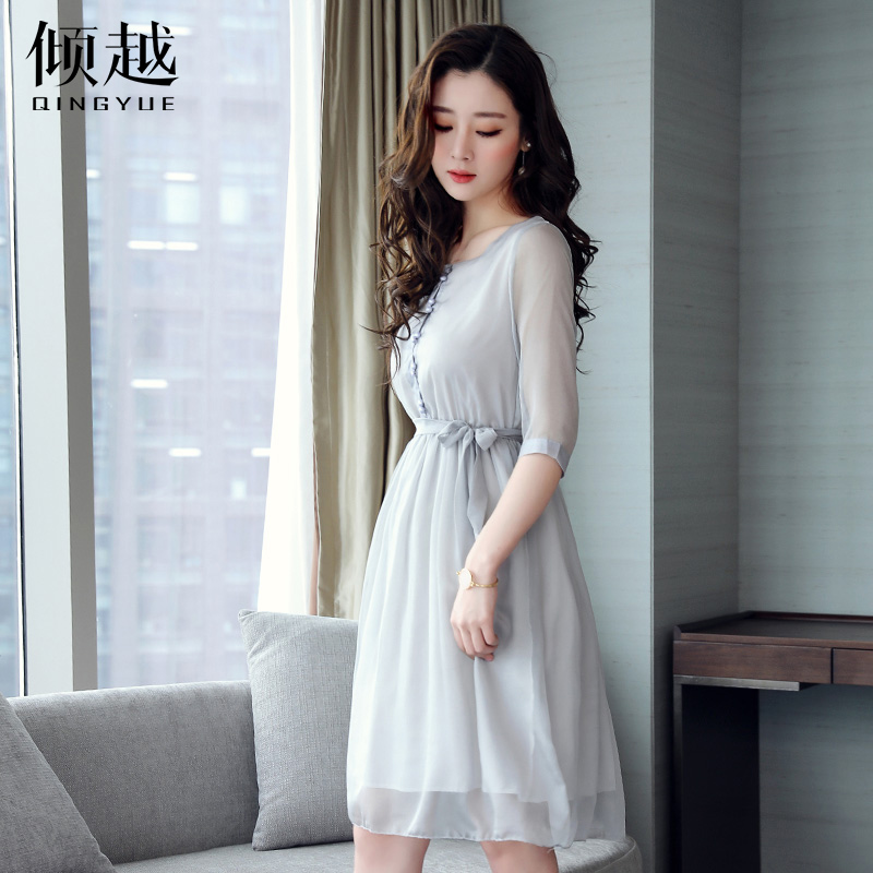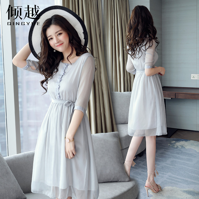 / 2017夏裝新款氣質雪紡連衣裙短袖修身顯瘦收腰中長款蕾絲網紗裙子