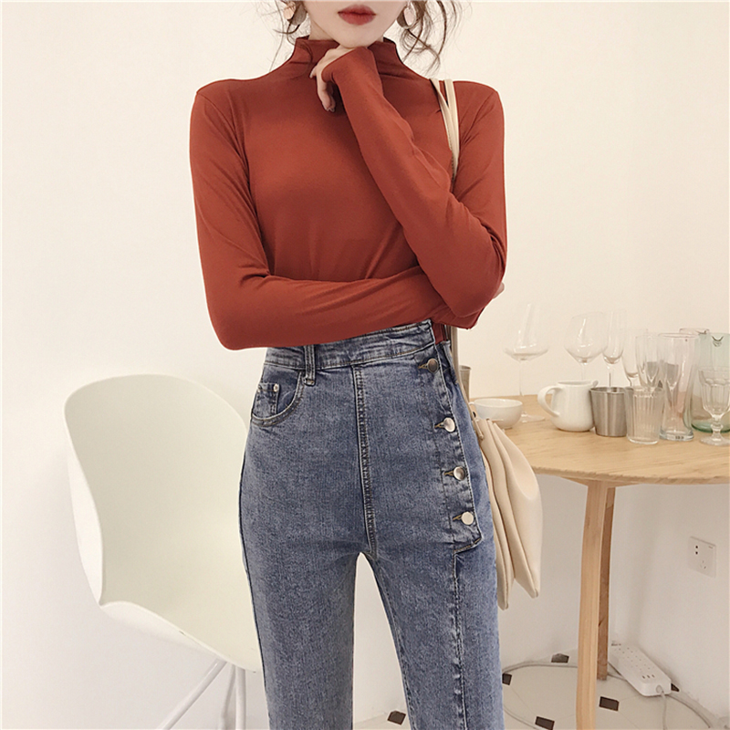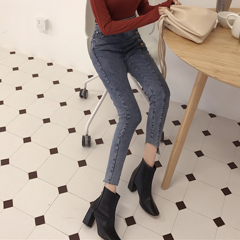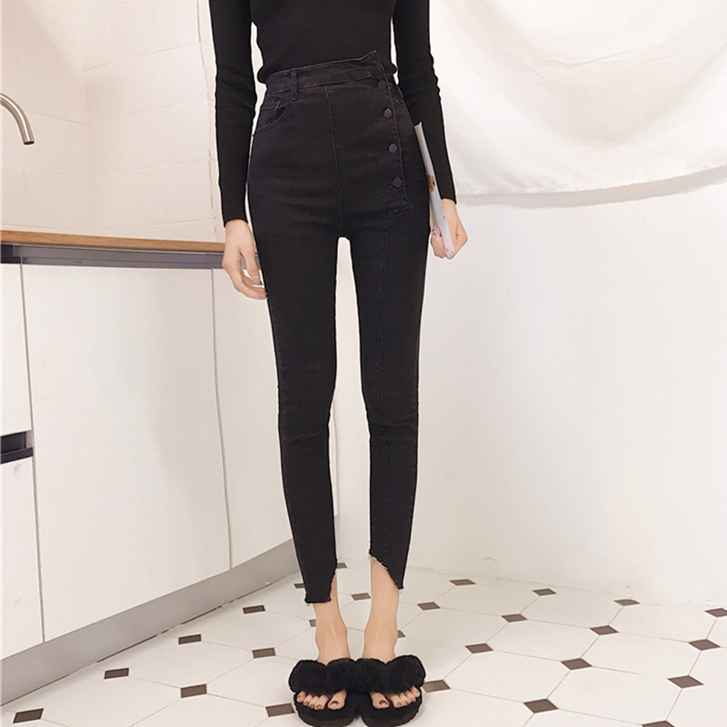 不規則排扣緊身高腰牛仔褲秋裝女2018新款修身彈力小腳鉛筆褲子潮