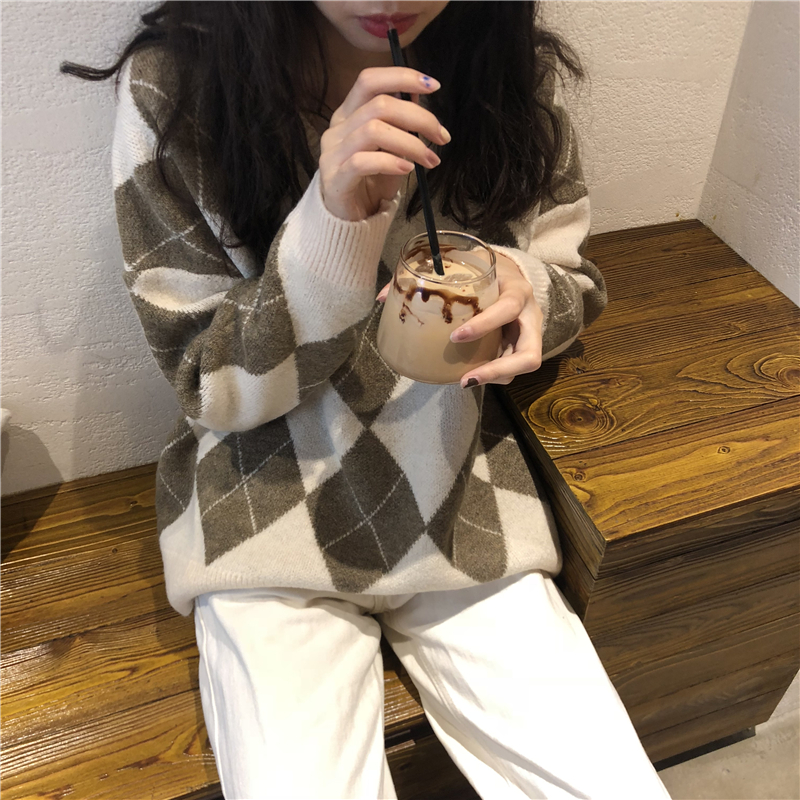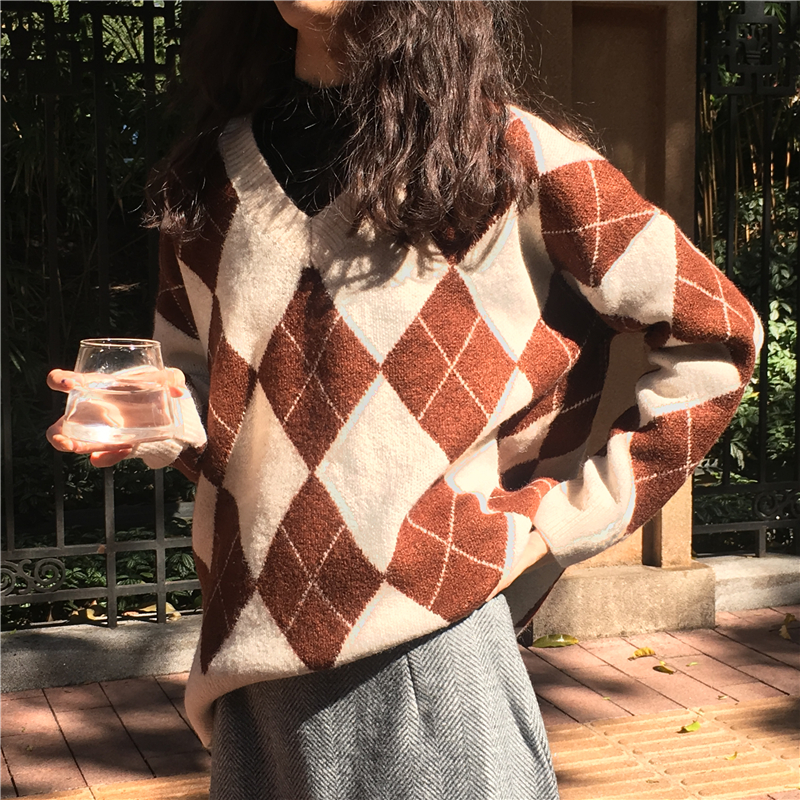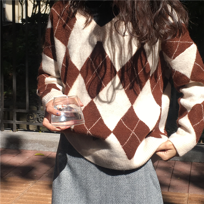 / 撞色菱格套頭針織外套女2018秋冬裝新款韓版寬松休閑長袖V領毛衣