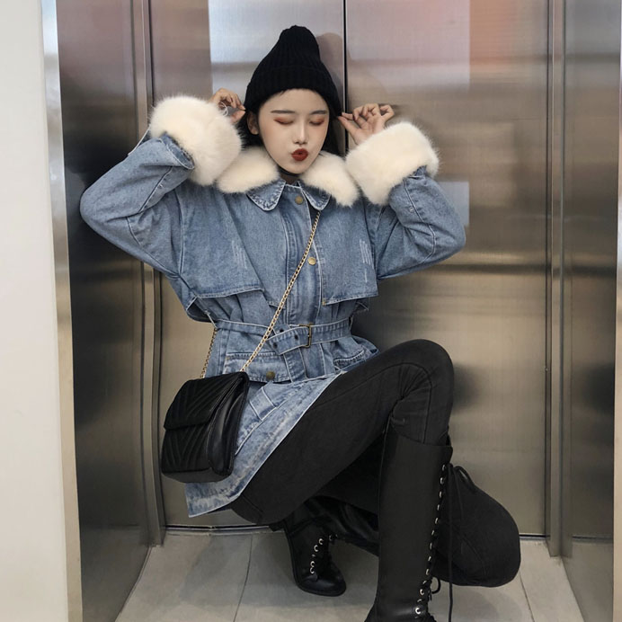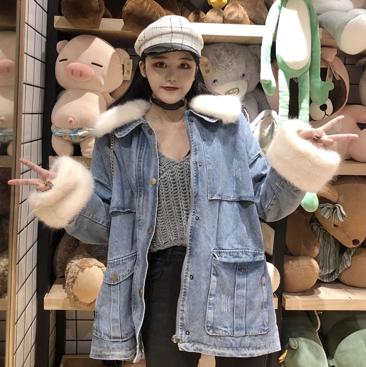 / 港味加厚保暖牛仔棉衣冬季大毛領毛毛袖學生百搭可愛收腰牛仔外套