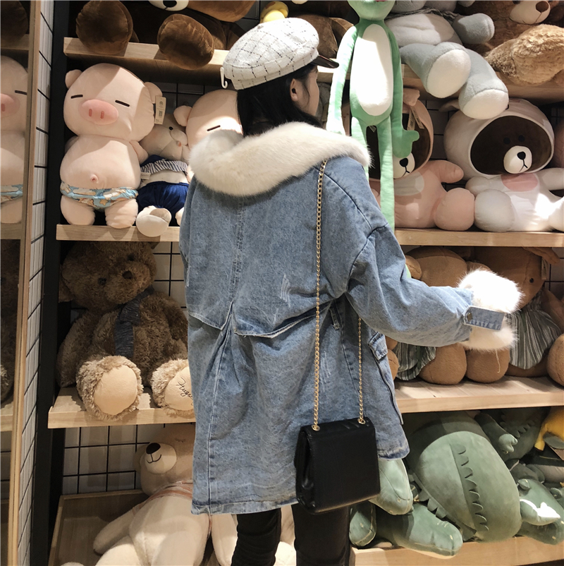 港味加厚保暖牛仔棉衣冬季大毛領毛毛袖學生百搭可愛收腰牛仔外套