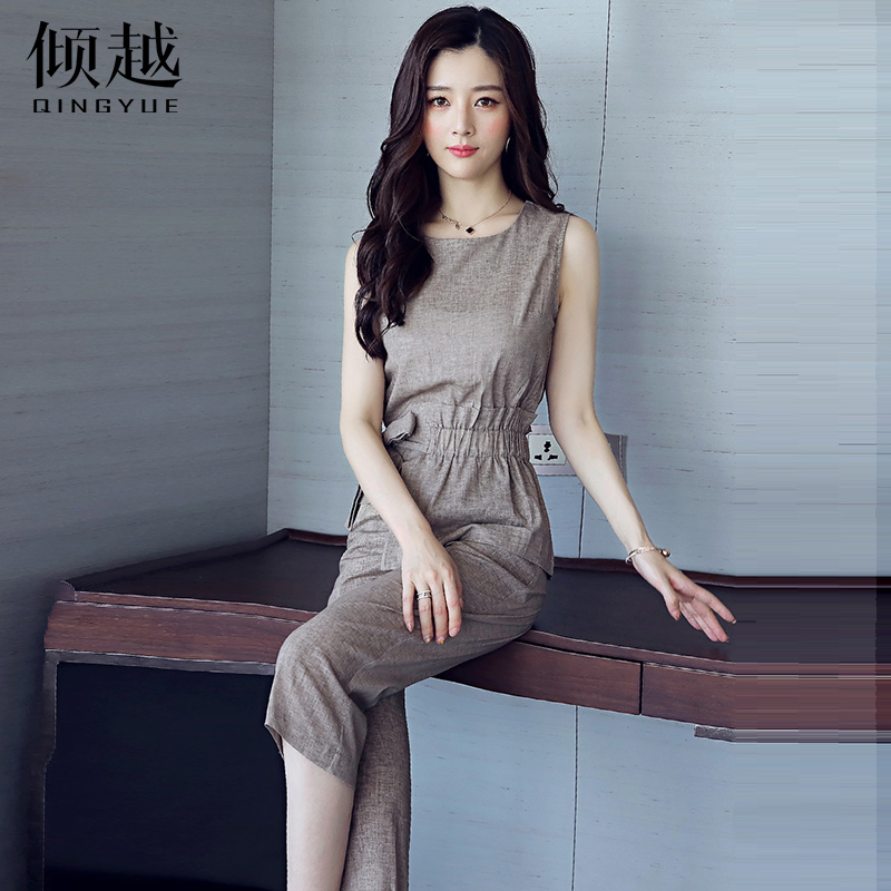雪紡連體闊腿褲女2017夏裝新款韓版無袖圓領七分褲套裝顯瘦連衣褲