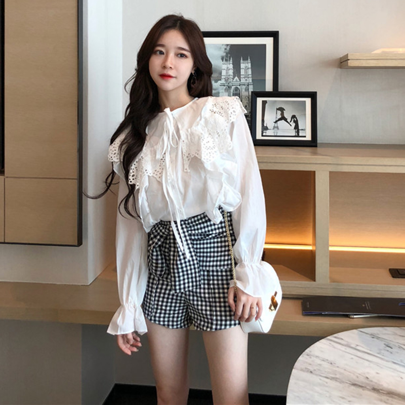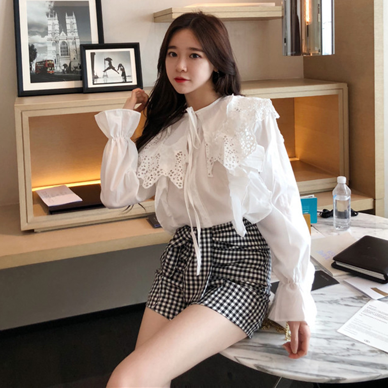 / 洋氣上衣秋裝女2018新款寬松顯瘦蕾絲花邊白襯衫氣質長袖娃娃襯衣