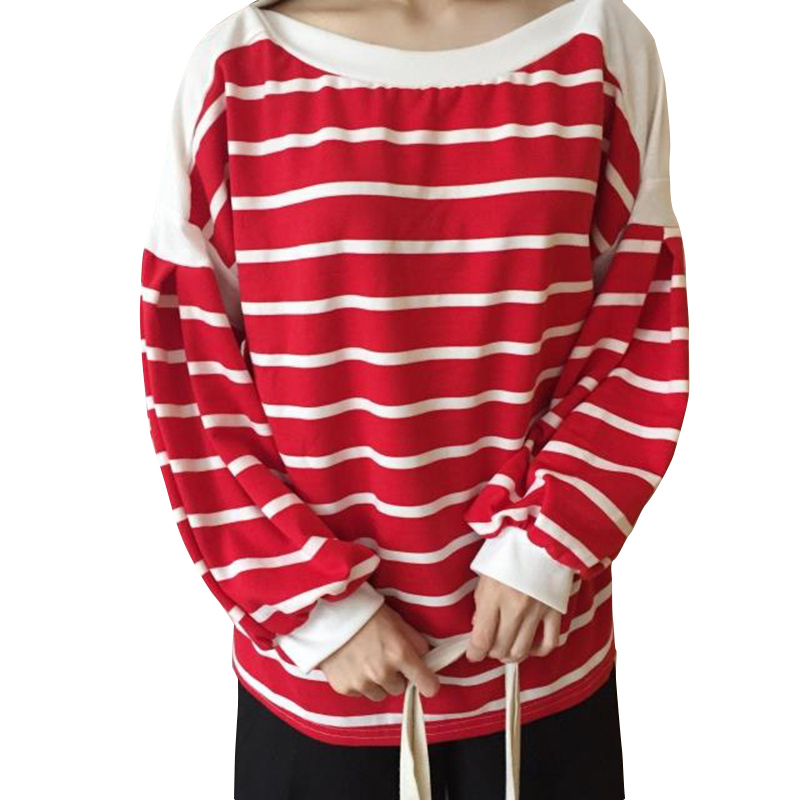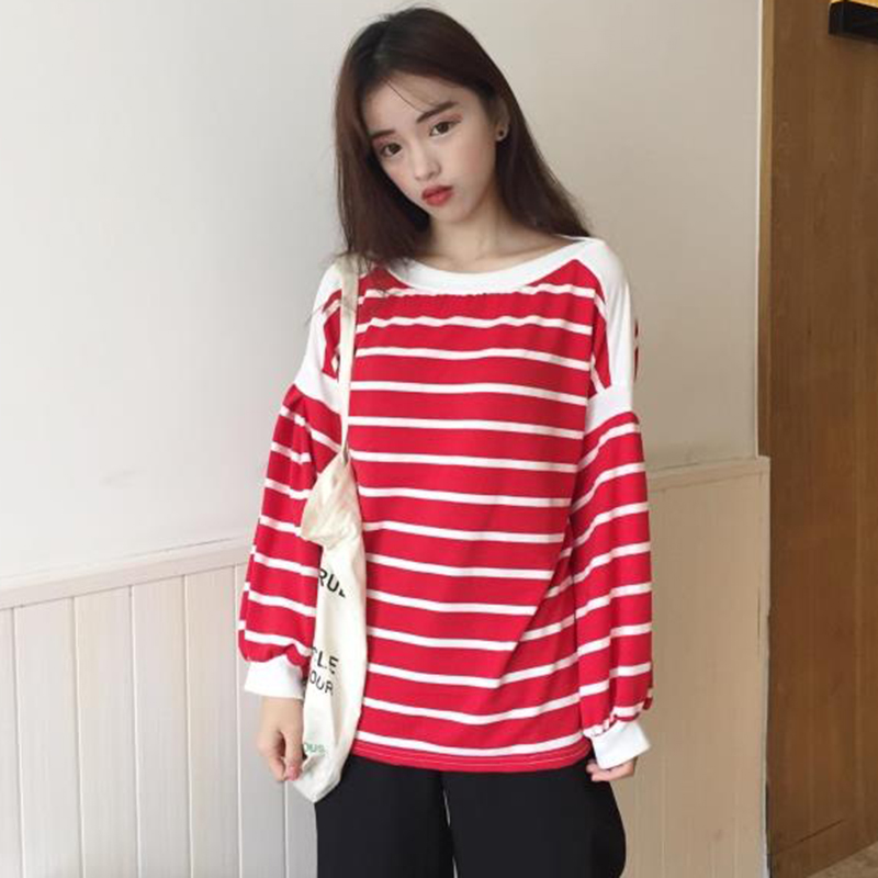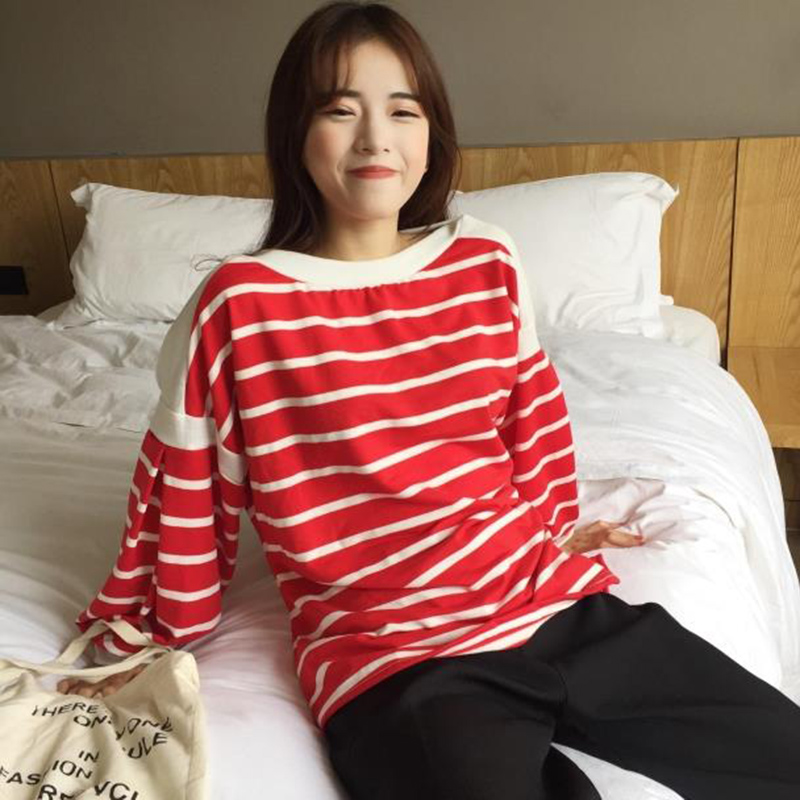 / 衛衣女早秋新款韓版女裝寬松顯瘦圓領燈籠長袖拼接條紋T恤上衣潮
