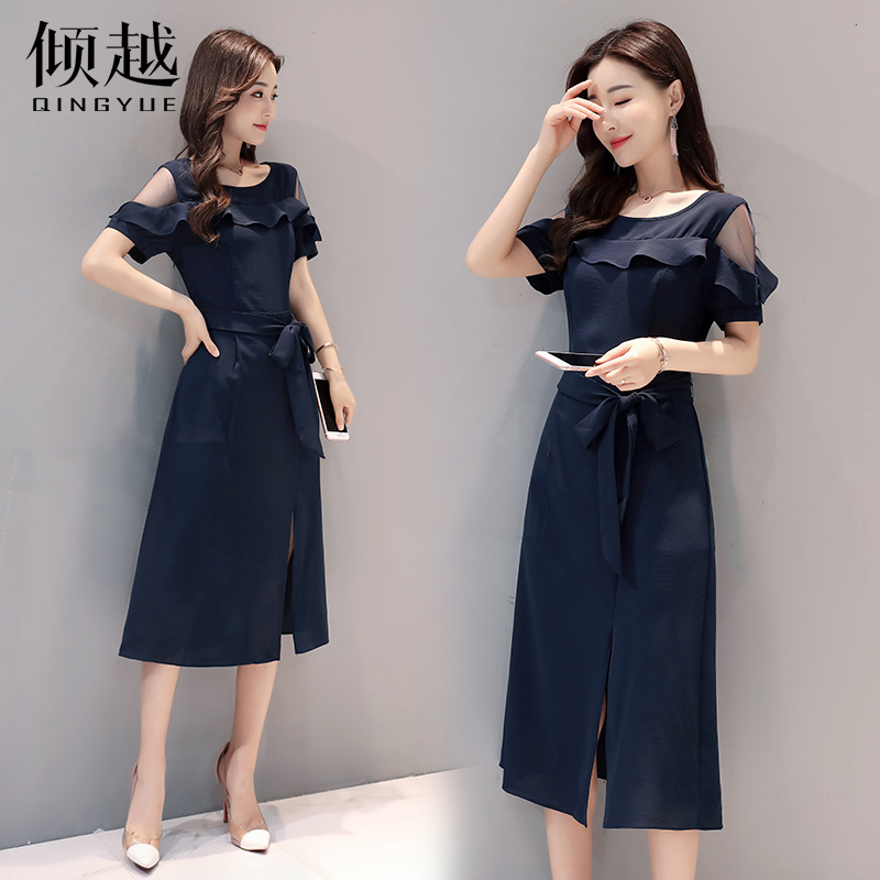 / 女裝2017夏新款名媛氣質韓版漏肩修身荷葉邊開叉連衣裙中長款裙子