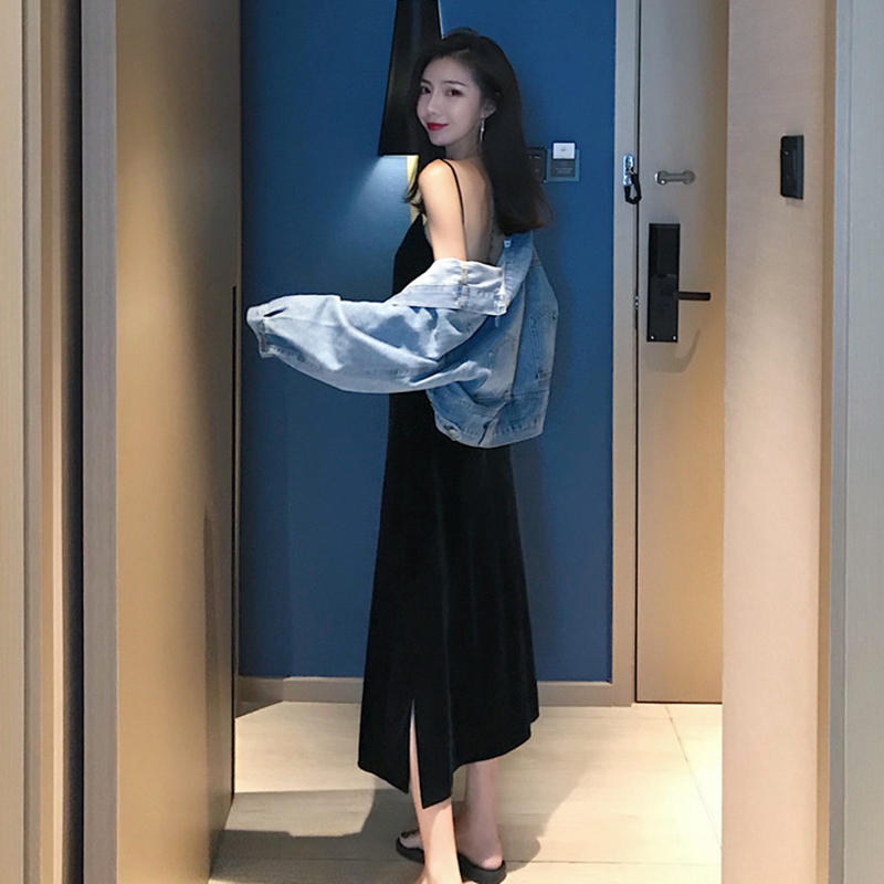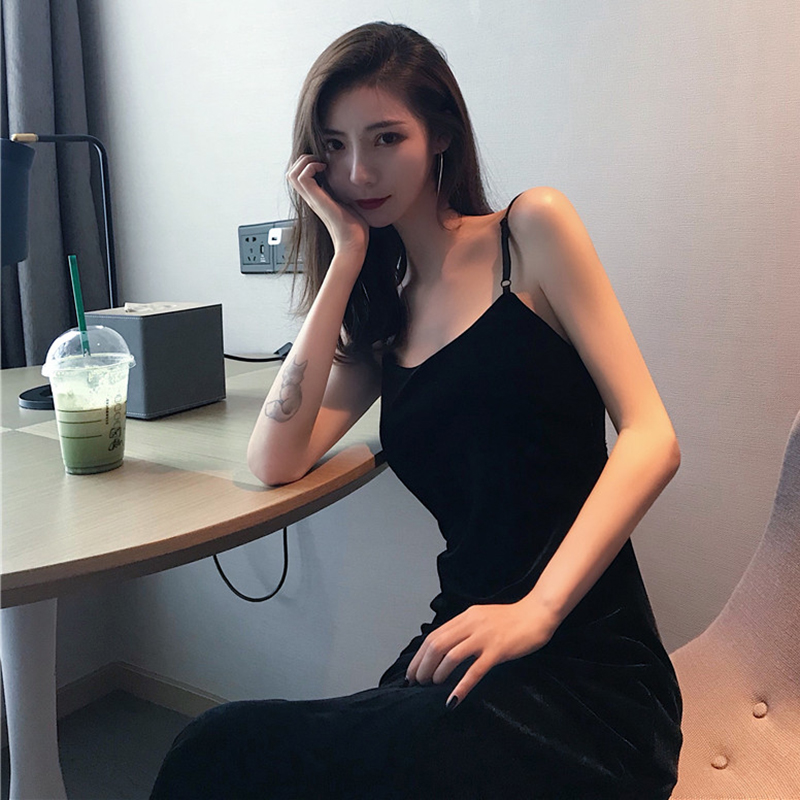 / 復古氣質絲絨黑裙子秋裝女2018新款時尚露背吊帶連衣裙打底中長裙