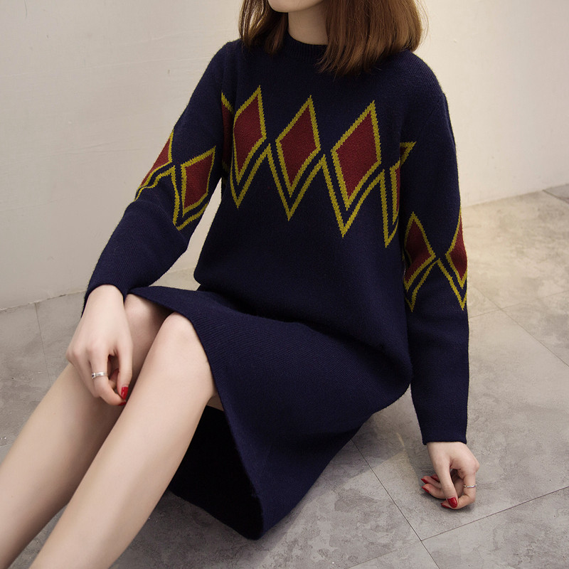 套頭圓領毛衣女秋冬拼色菱形格打底衫中長款寬松毛衣裙加厚外套女